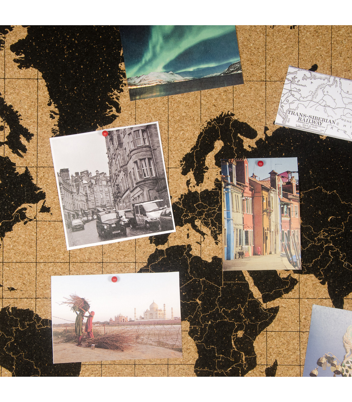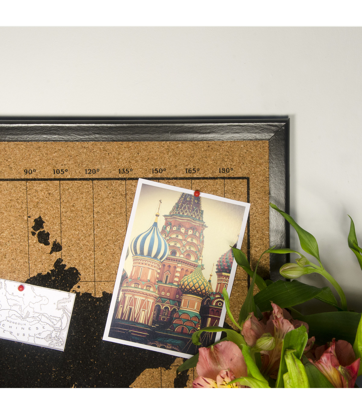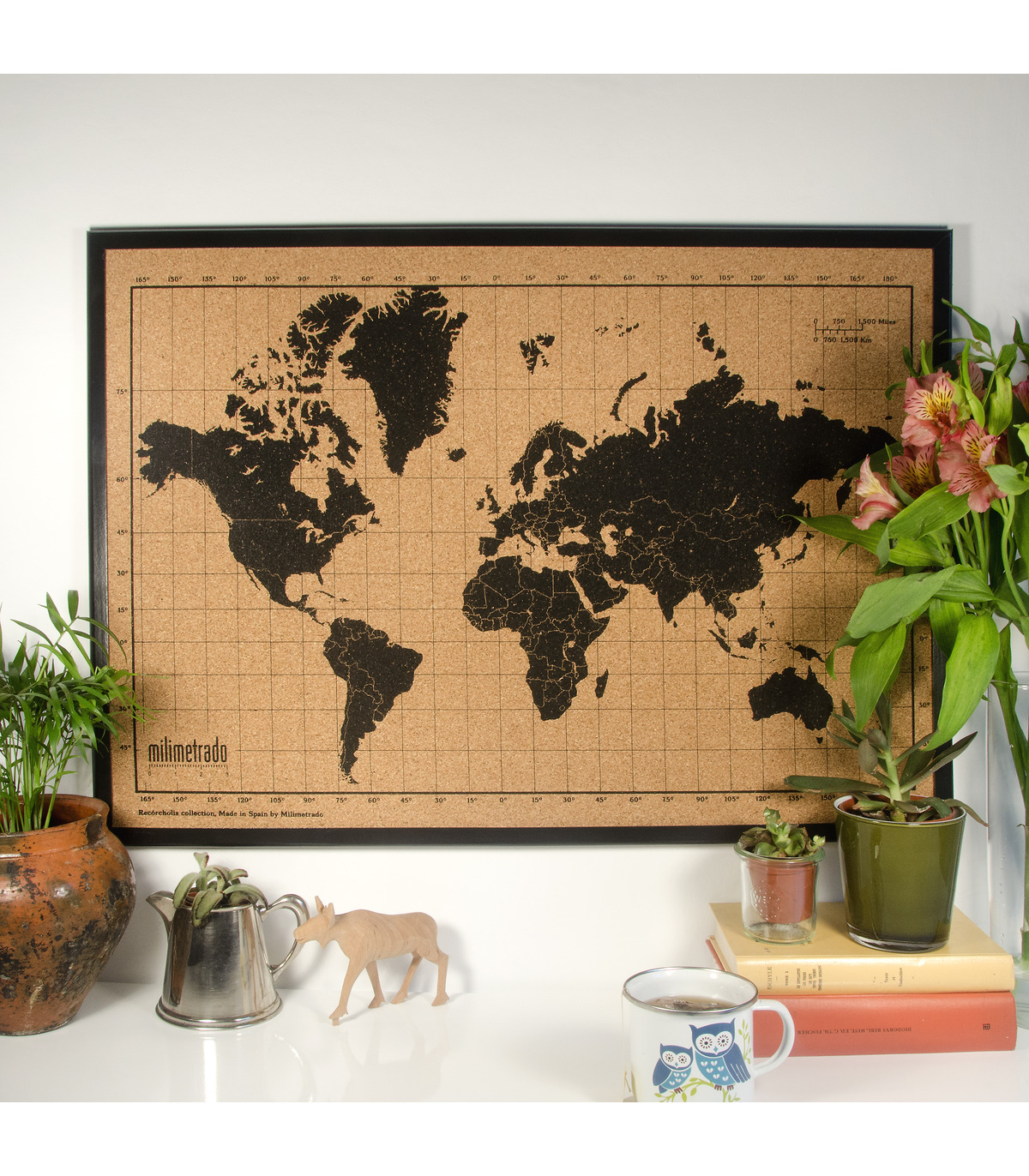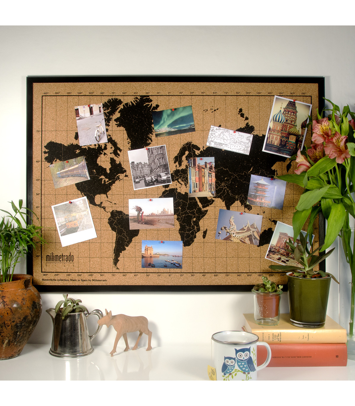 - Tablero de corcho con un mapamundi serigrafiado con marco negro.