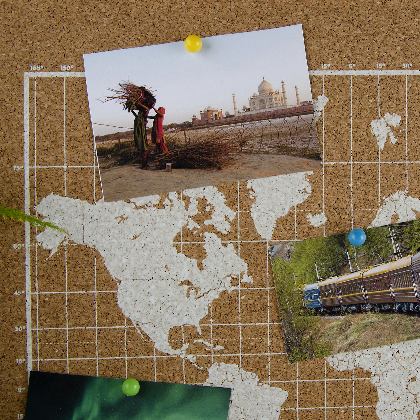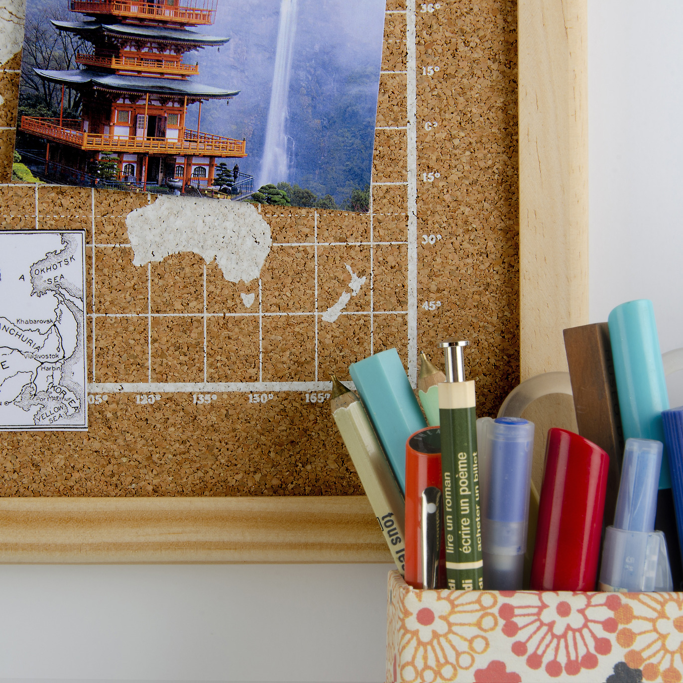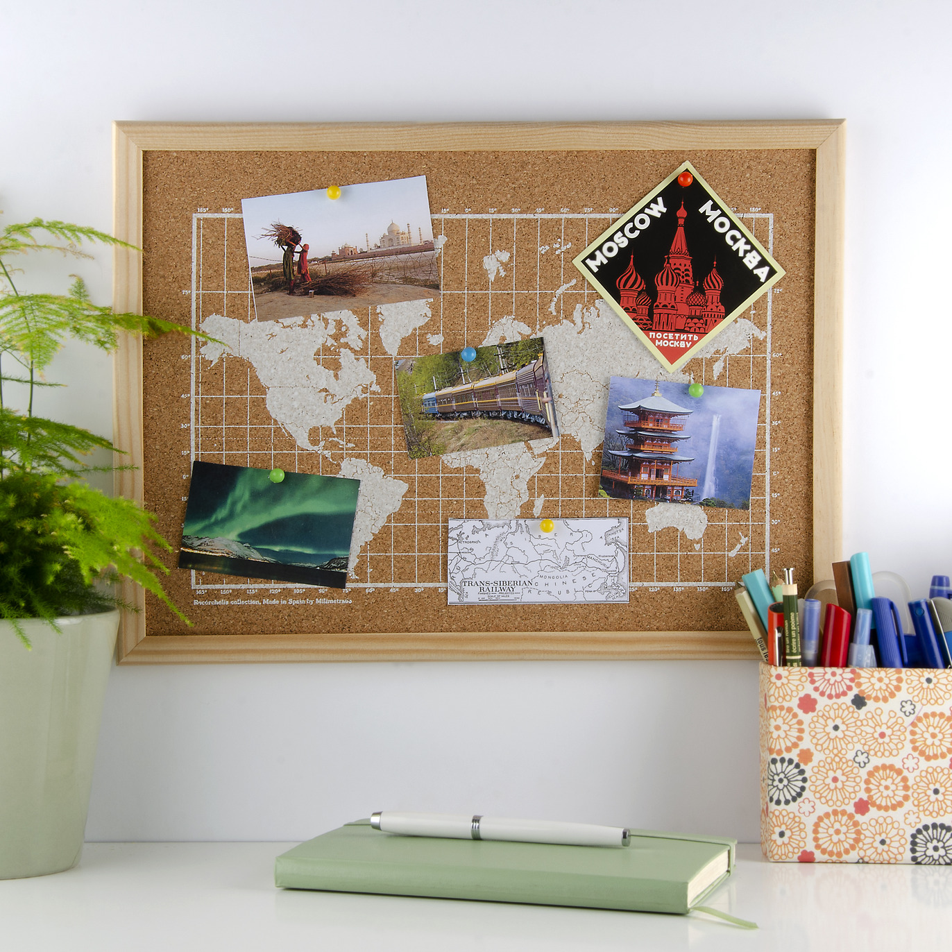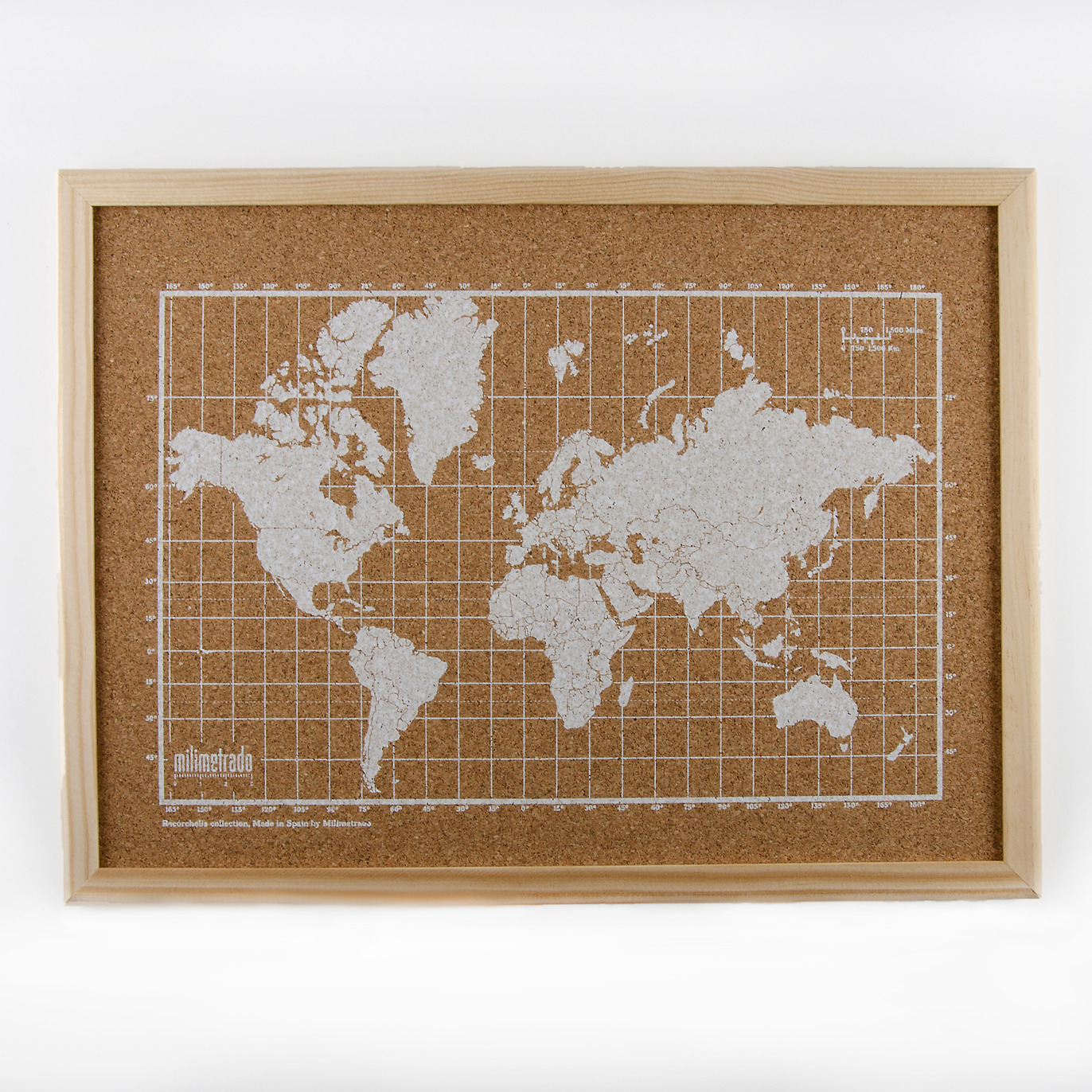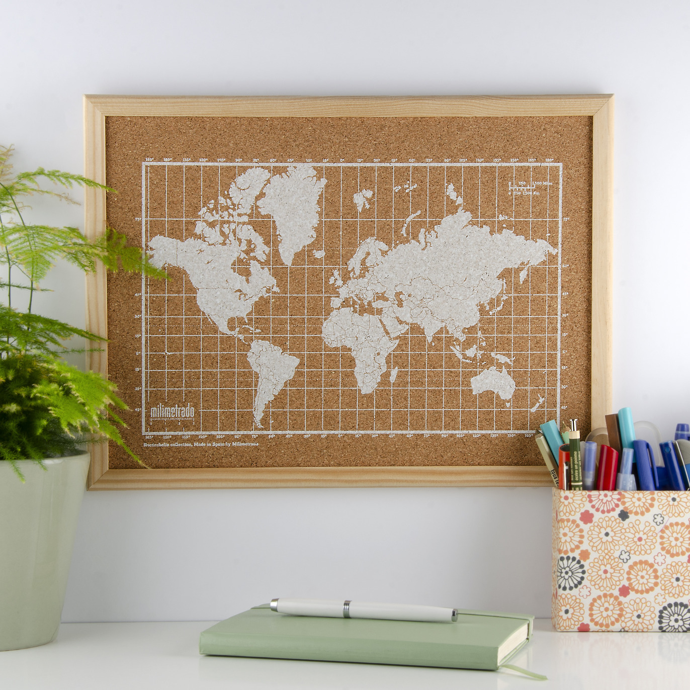 - Mini tablero de corcho con un mapamundi serigrafiado en color blanco.