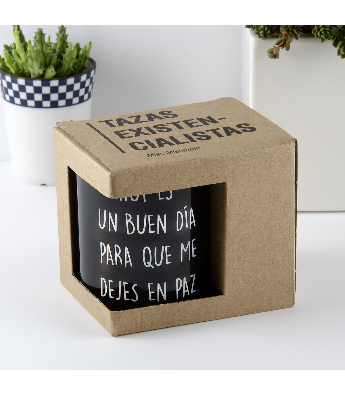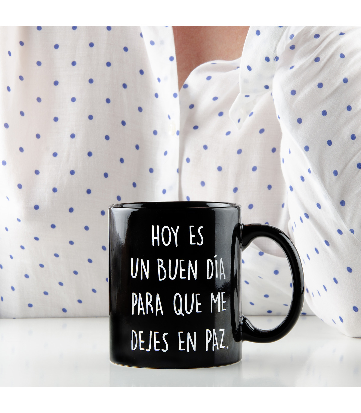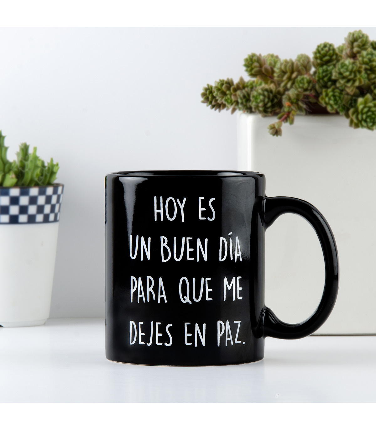 - Taza con el mensaje "Hoy es un buen día para que me dejes en paz" impreso en su parte frontal.