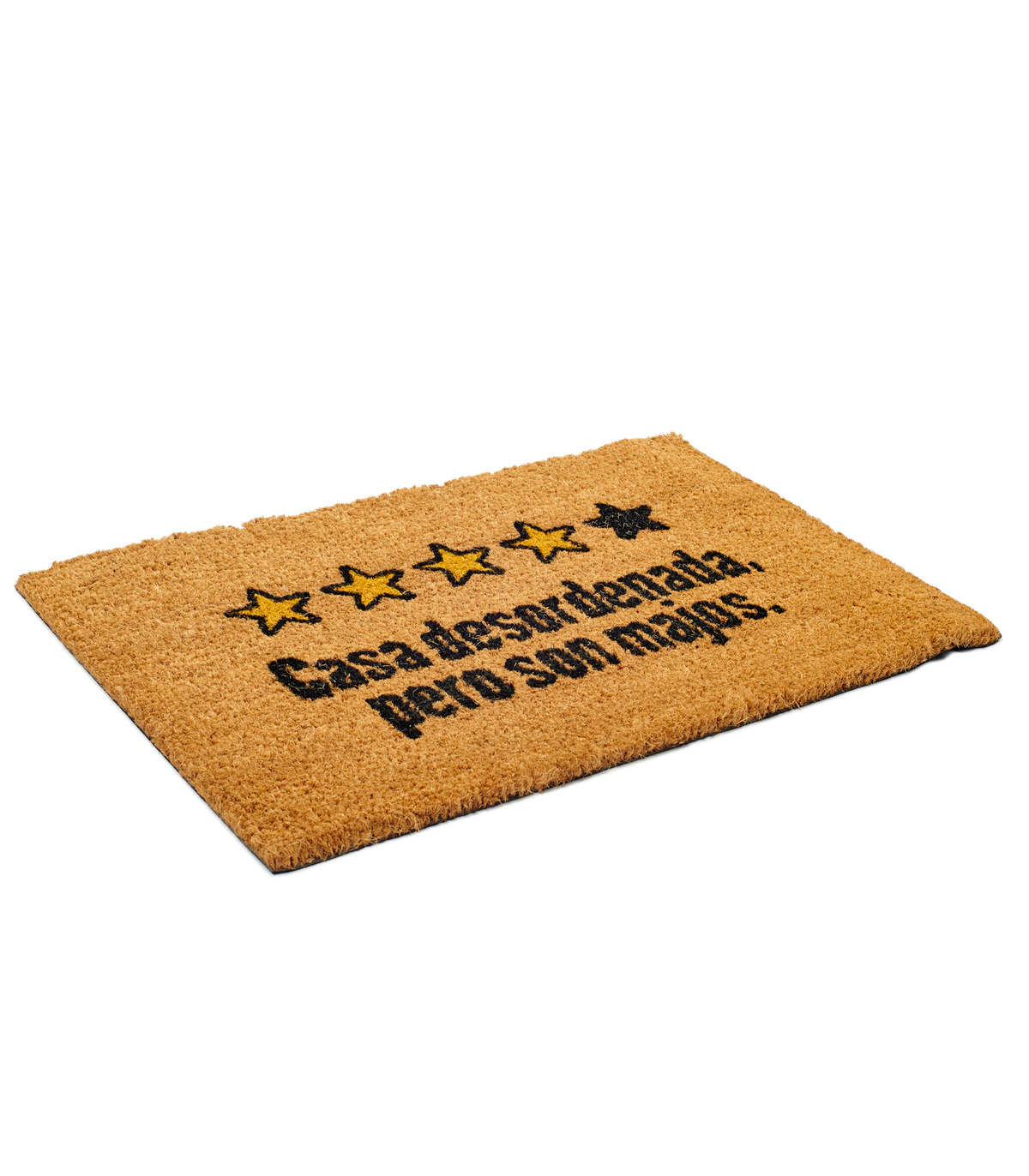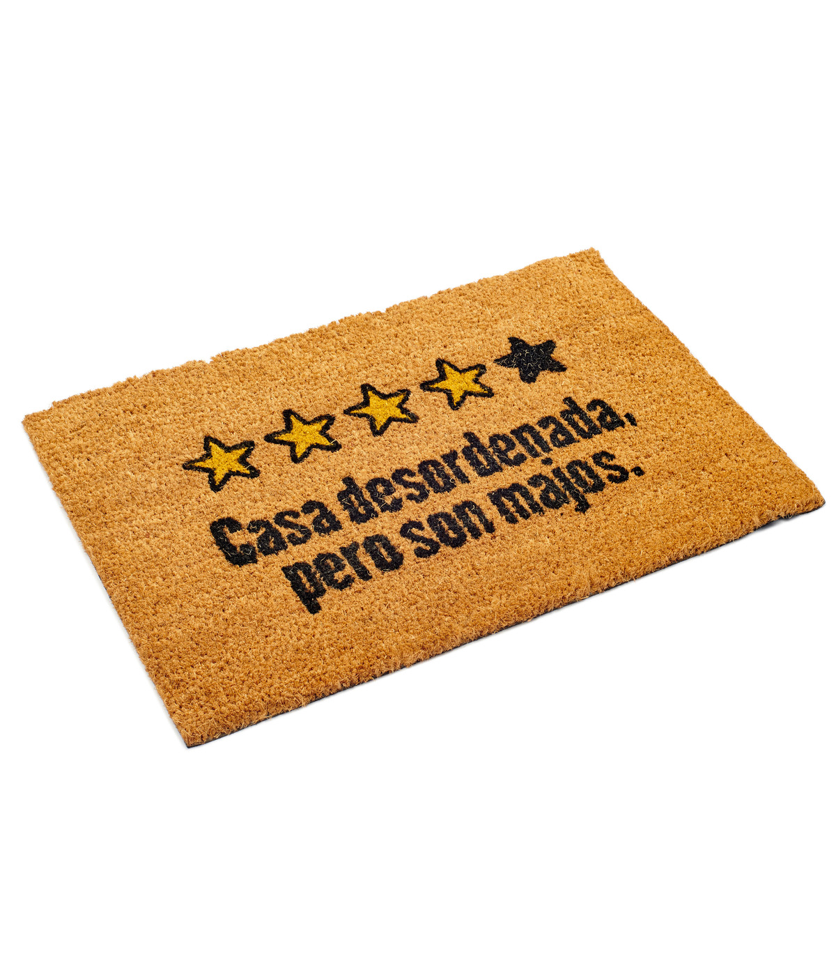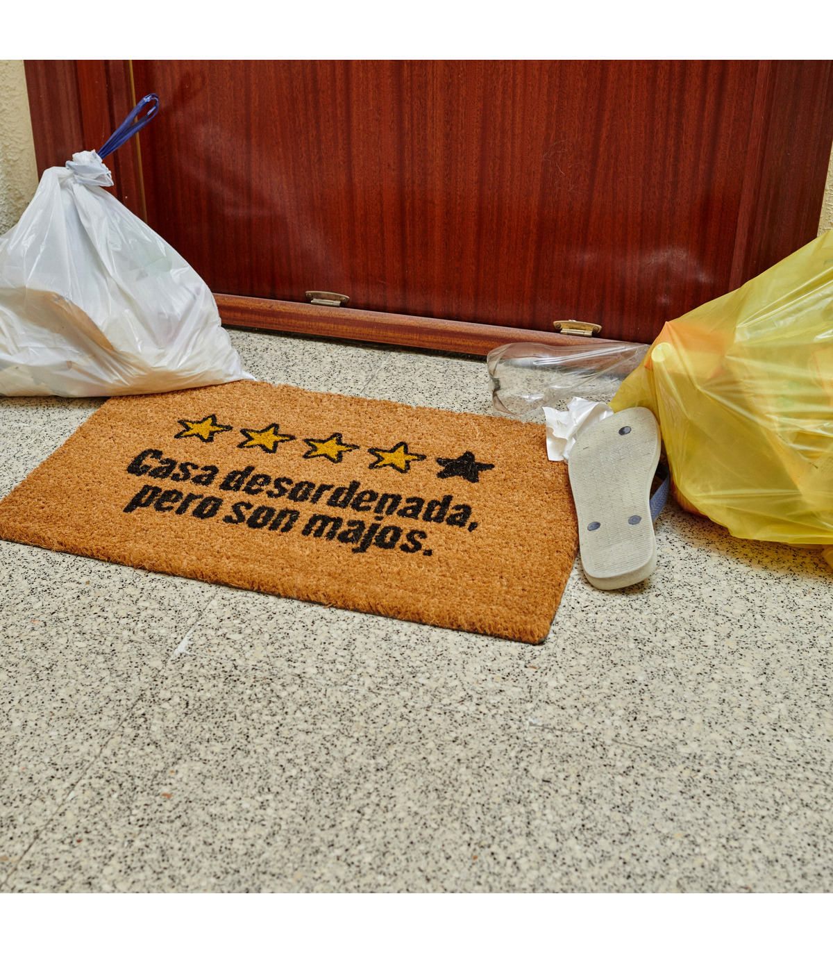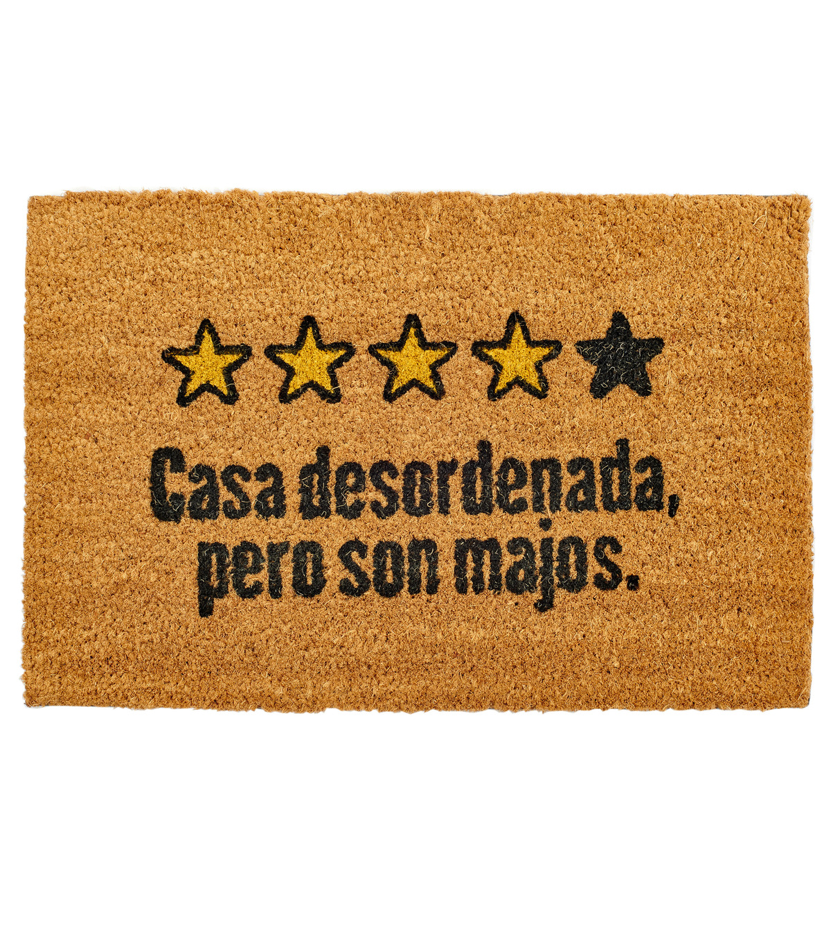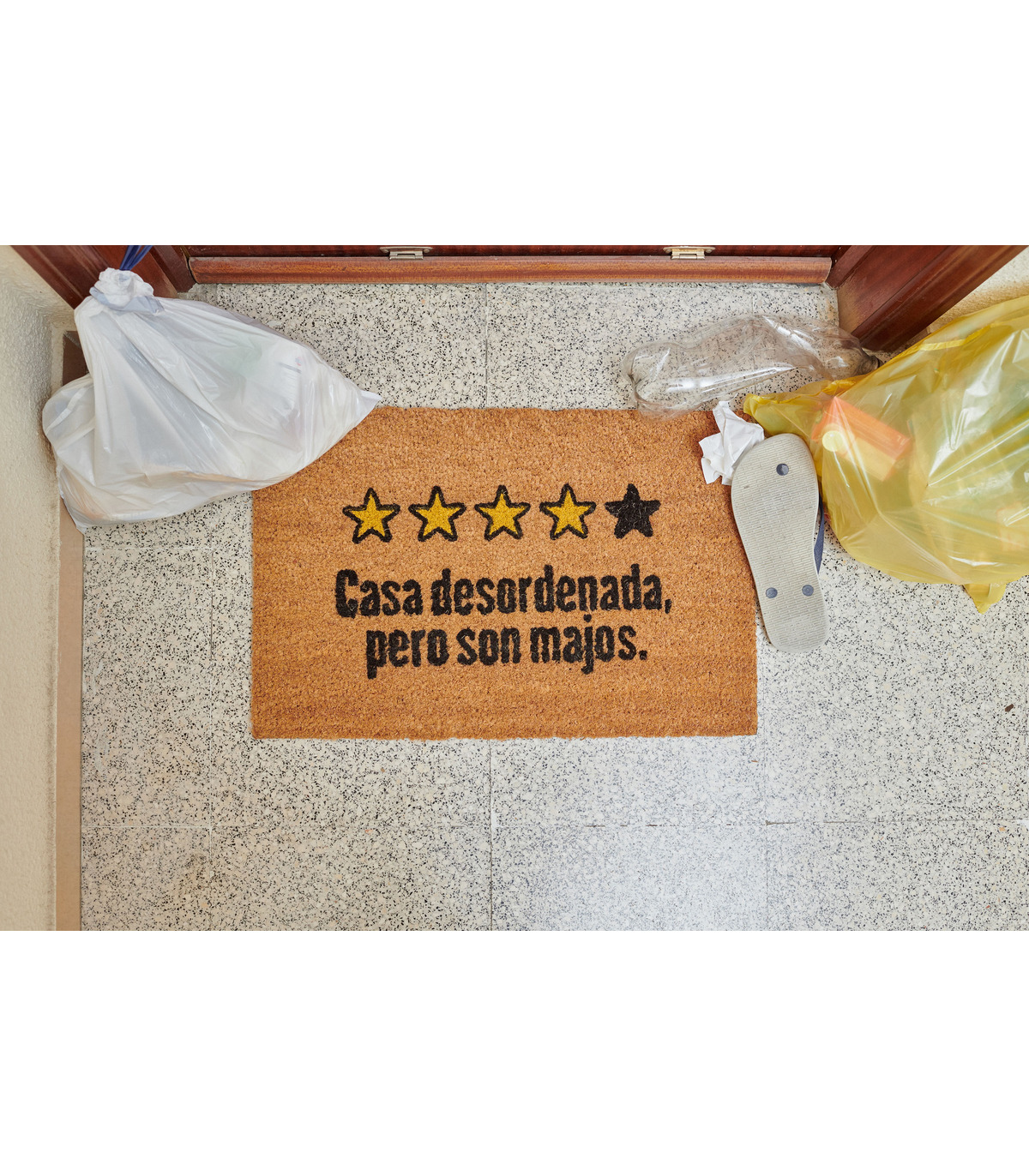 - Felpudo original con el mensaje "Casa desordenada, pero son majos" impreso en negro.