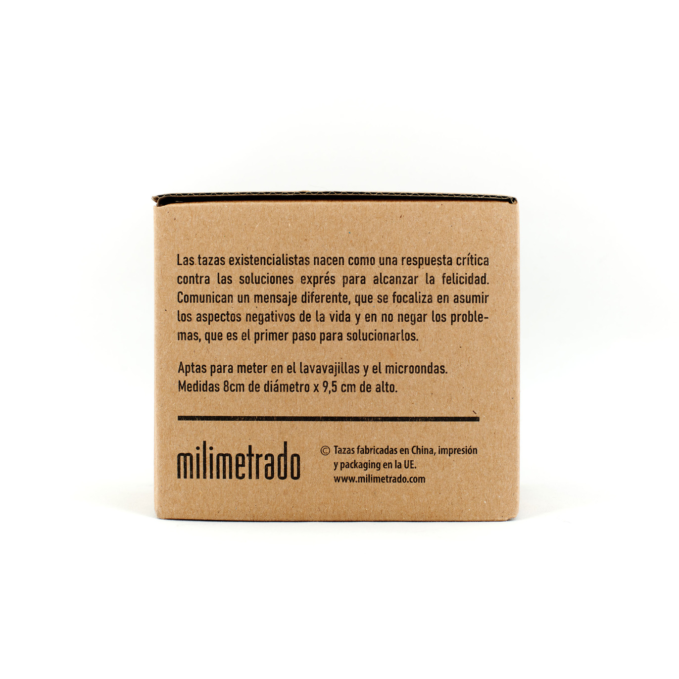 En las tazas existencialistas se comunica un mensaje radicalmente diferente, que se focaliza en asumir nuestros errores y en no negar el lado negativo de nuestra personalidad. Asumir nuestros fallos, aceptarlos y verbalizarlos. Ponerlos en blanco sobre negro.