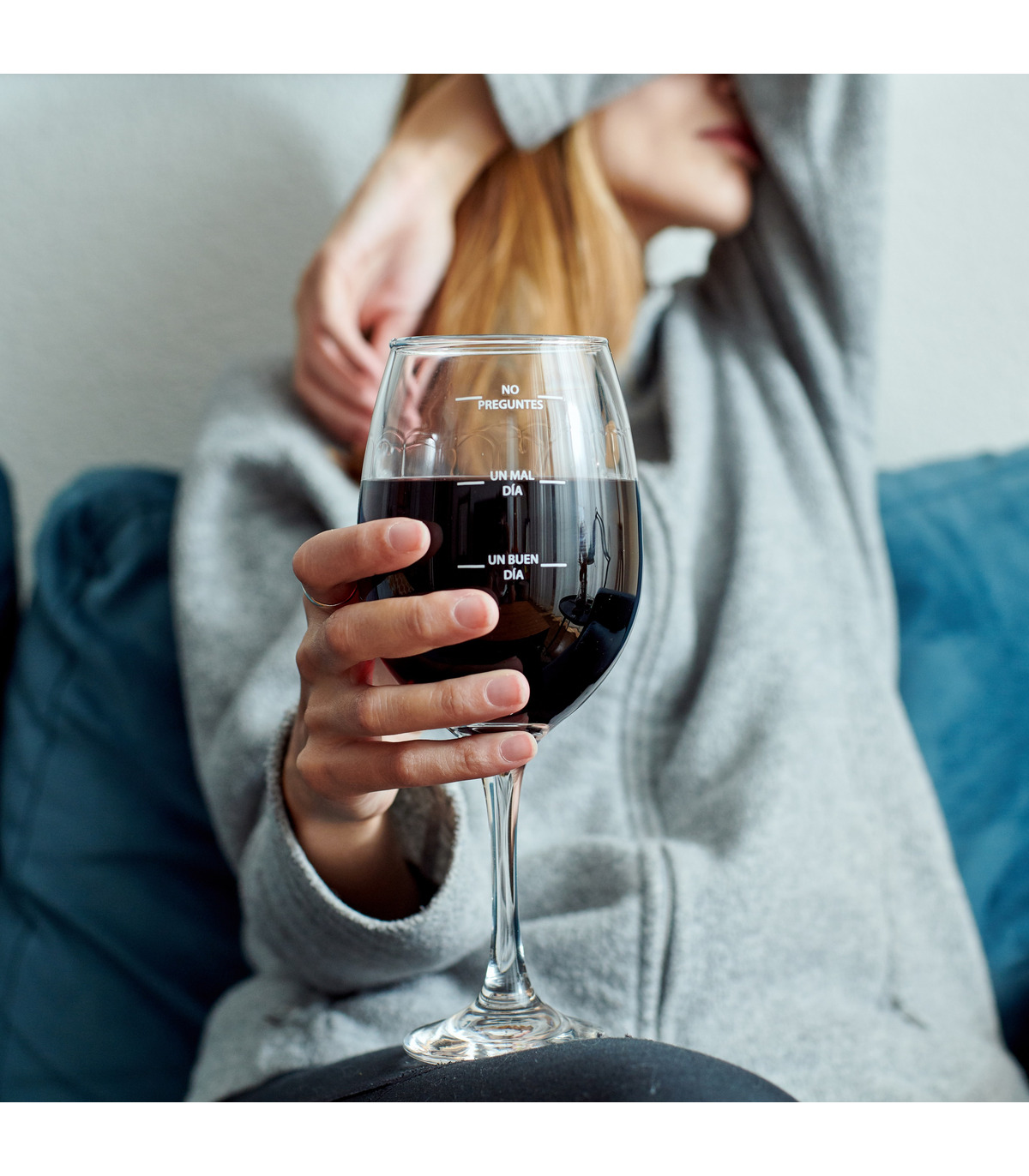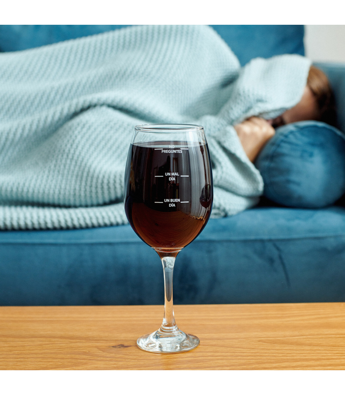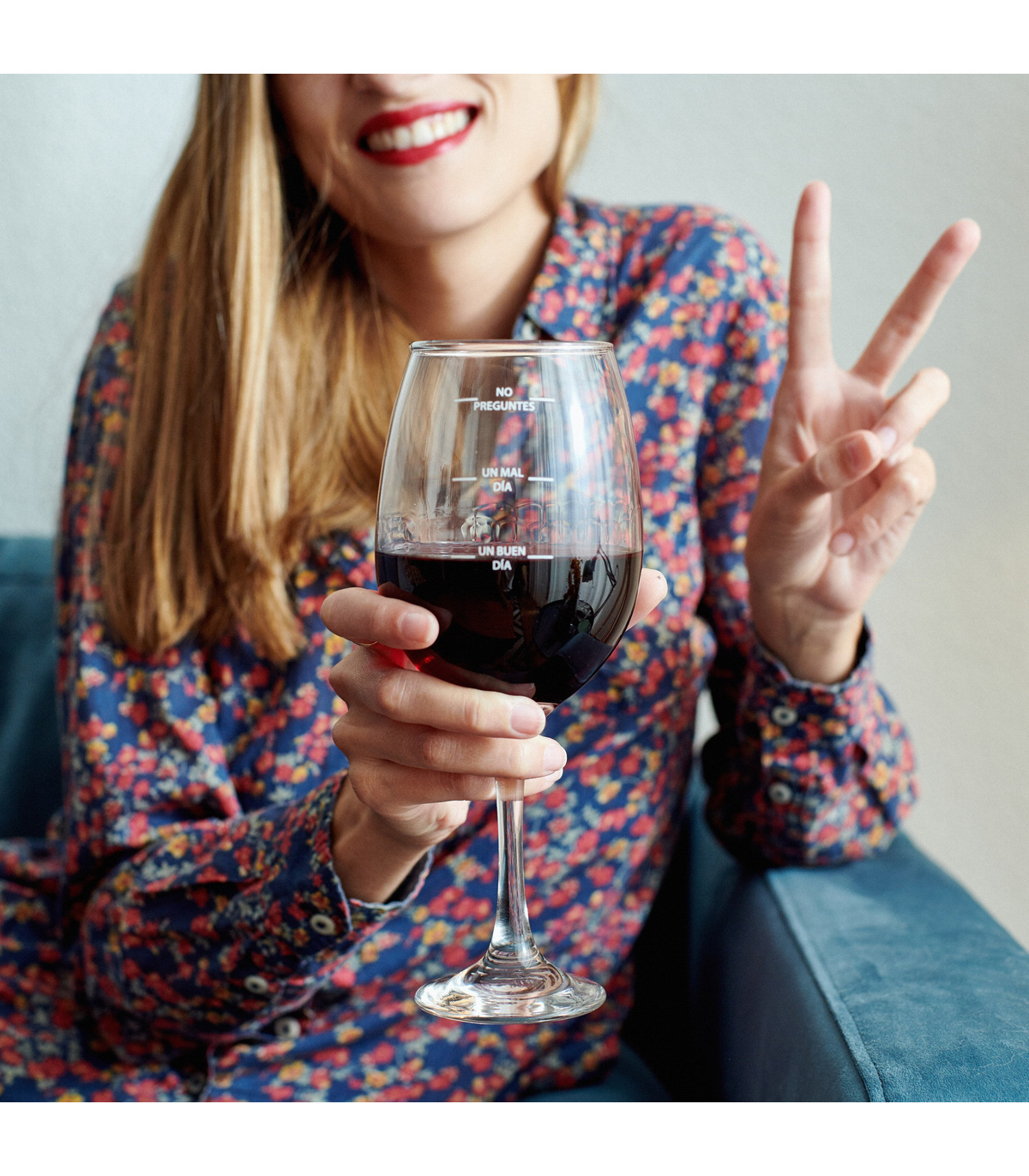 Acabar el día con una copita de vino sienta muy bien, pero hay días y días... algunos se necesita una dosis extra para sobrellevarlo (o para olvidarlo). Deja que esta copa de vino hable por ti llenándola hasta la marca que represente tu estado de ánimo: