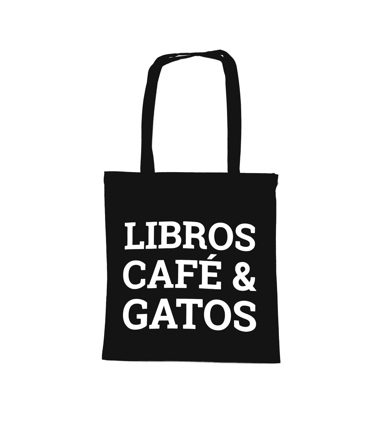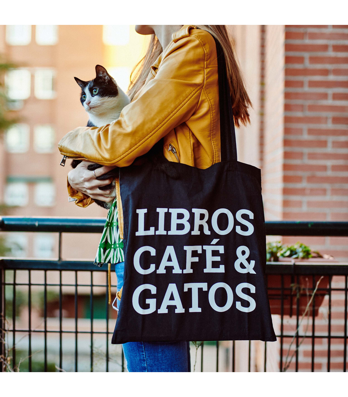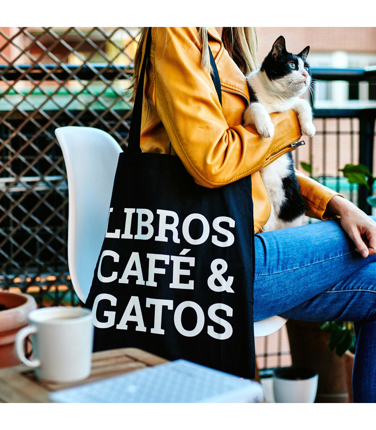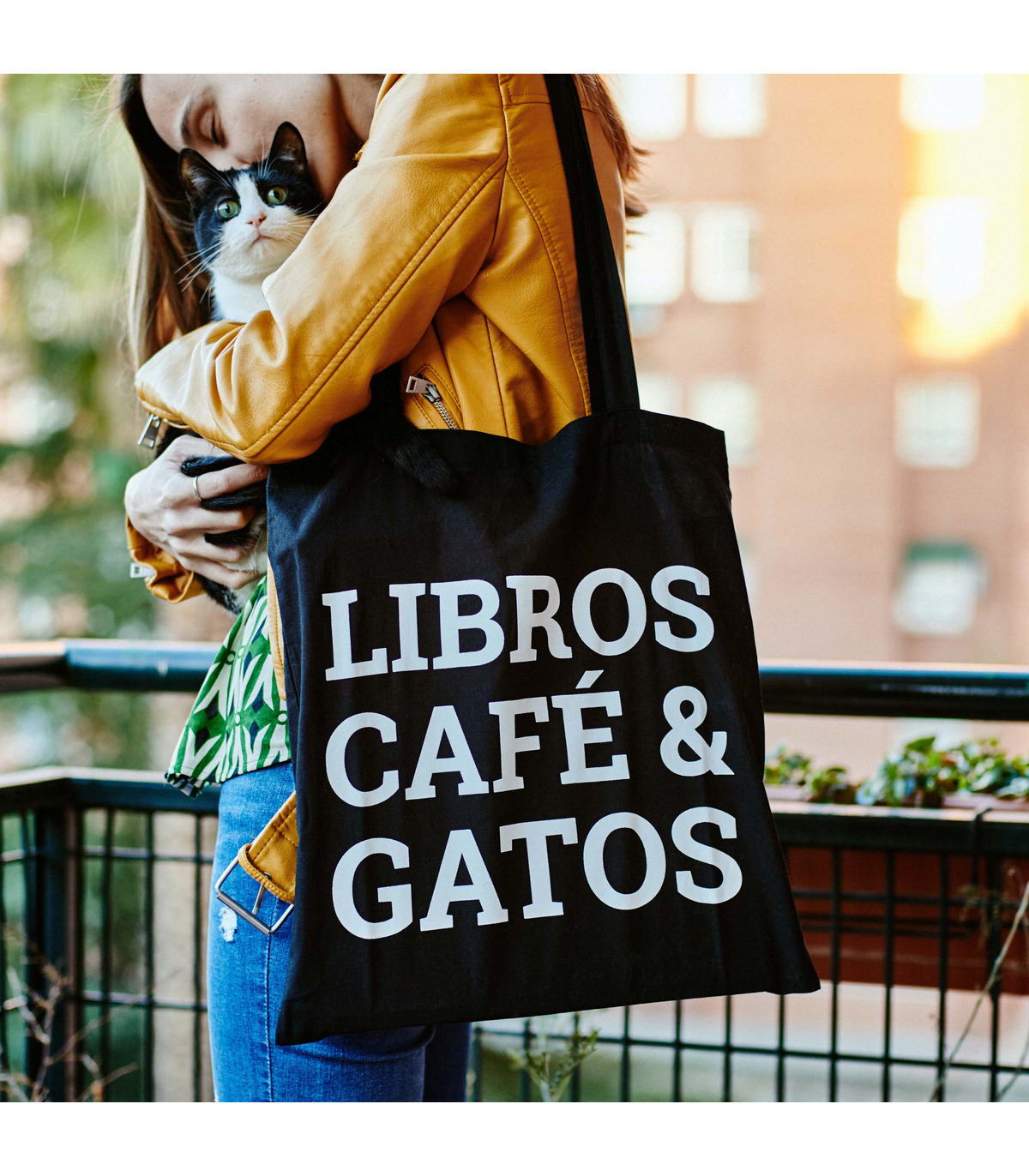 - Bolsa tipo tote bag con mensaje "Libros, café y gatos".