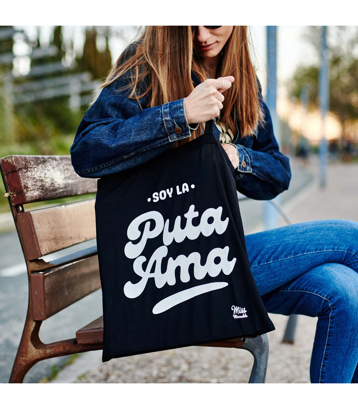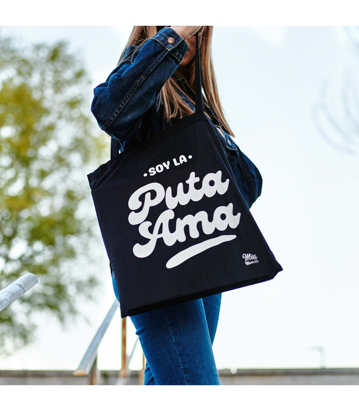 Fabricada 100% en algodón orgánico con certificado GOTS y con costuras laterales para evitar que encoja al lavarse, esta bolsa lleva impreso en blanco sobre negro el mensaje políticamente incorrecto "Soy la p*** ama".