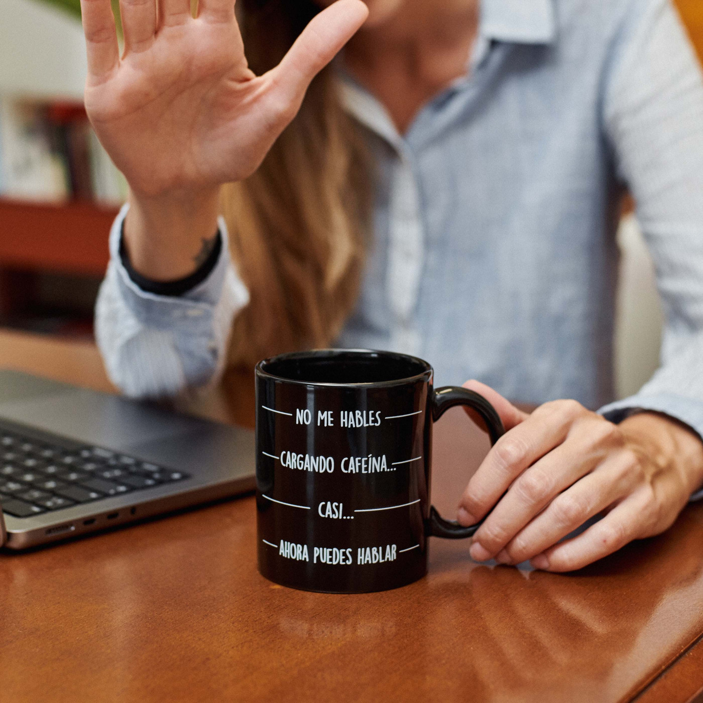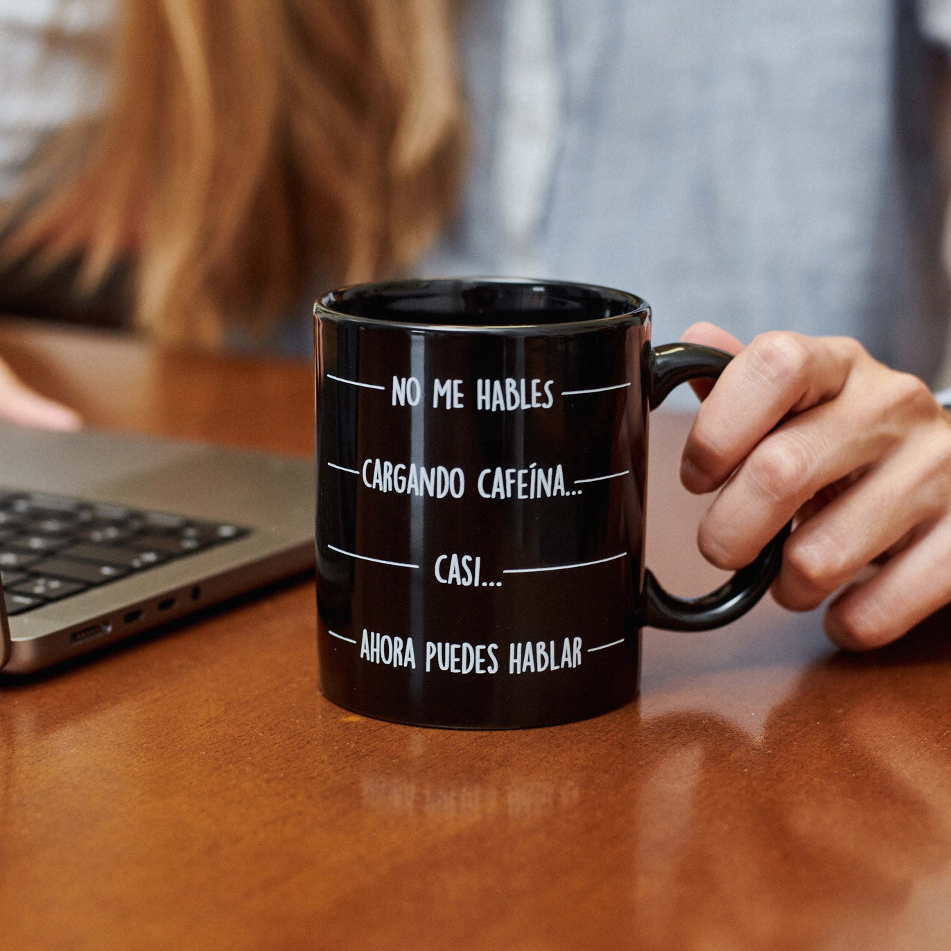 - Taza con el mensaje: No me hables, Cargando cafeína, Casi.