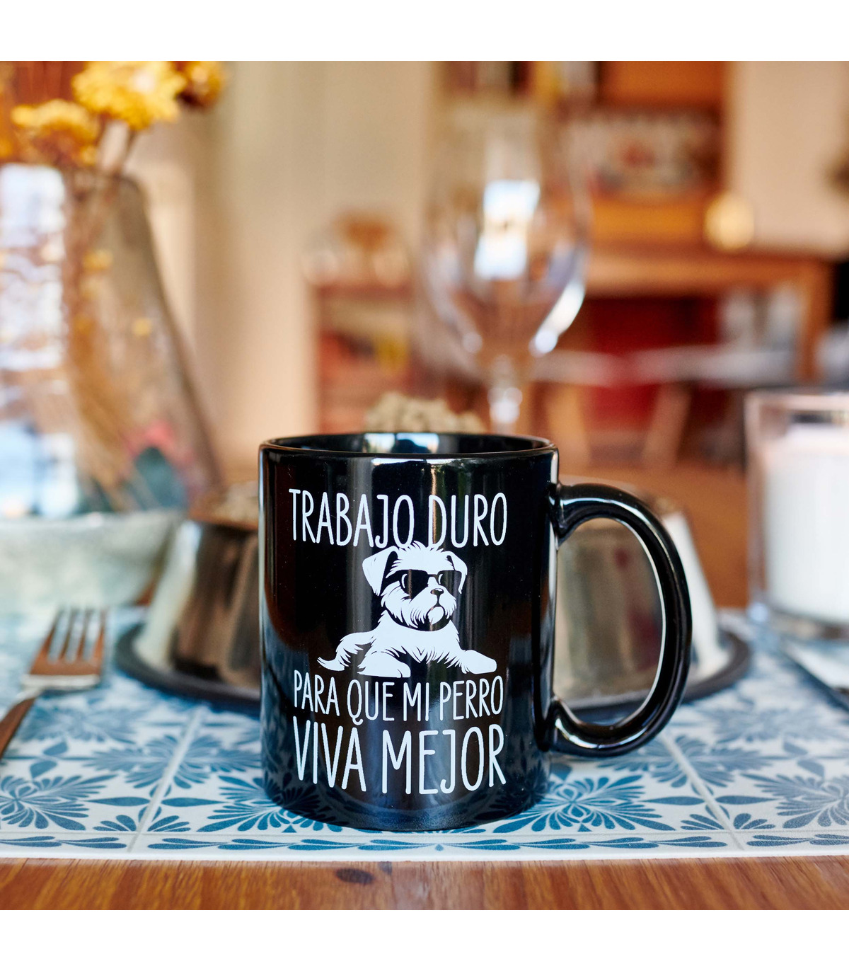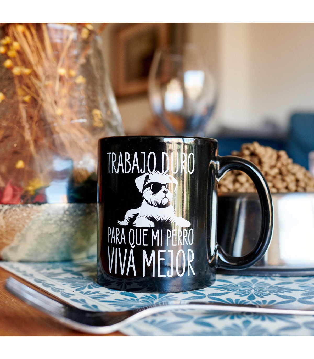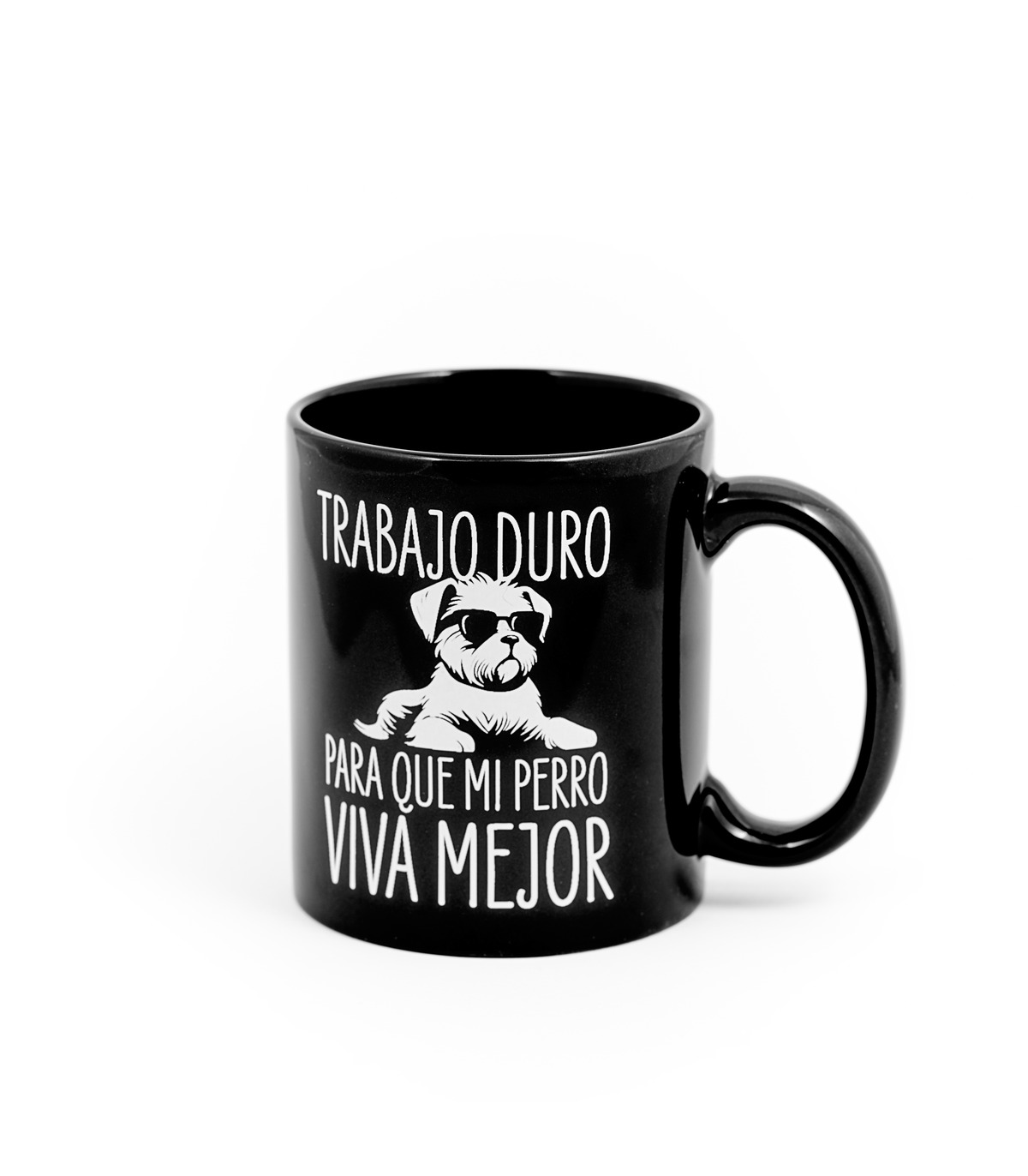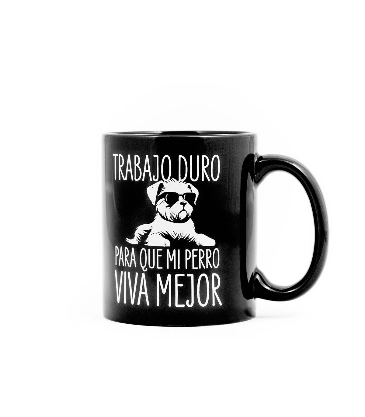 - Taza con el mensaje "Trabajo duro para que mi perro viva mejor" y la ilustración de un perrito con gafas impresos en su parte frontal.