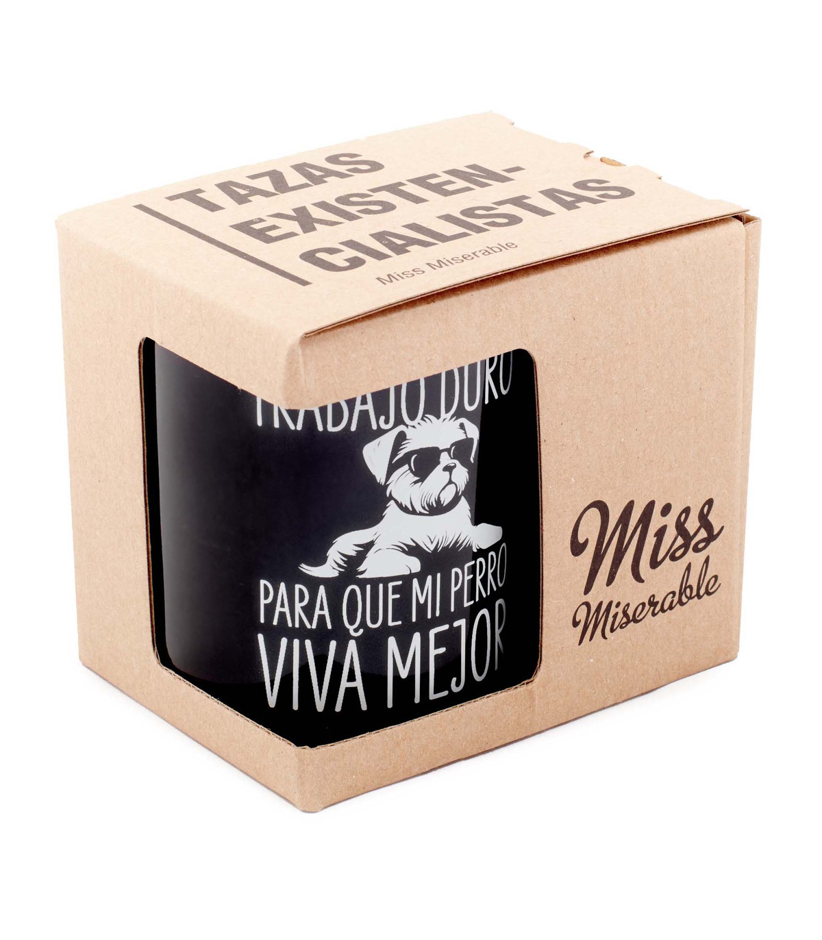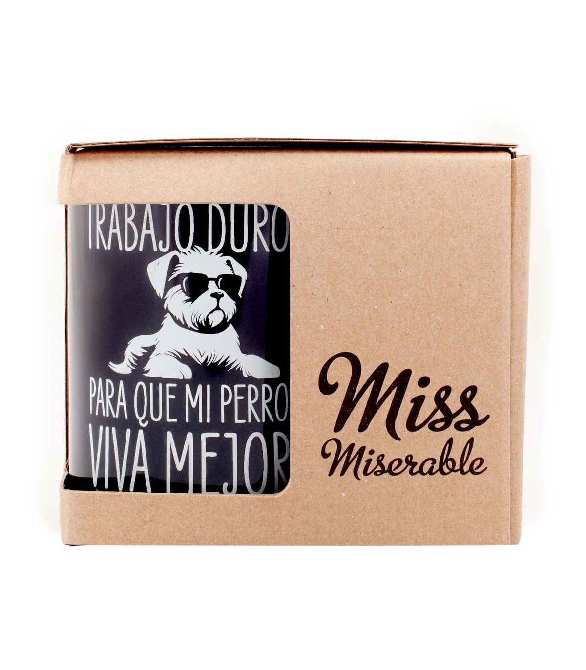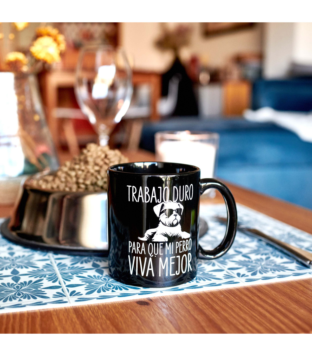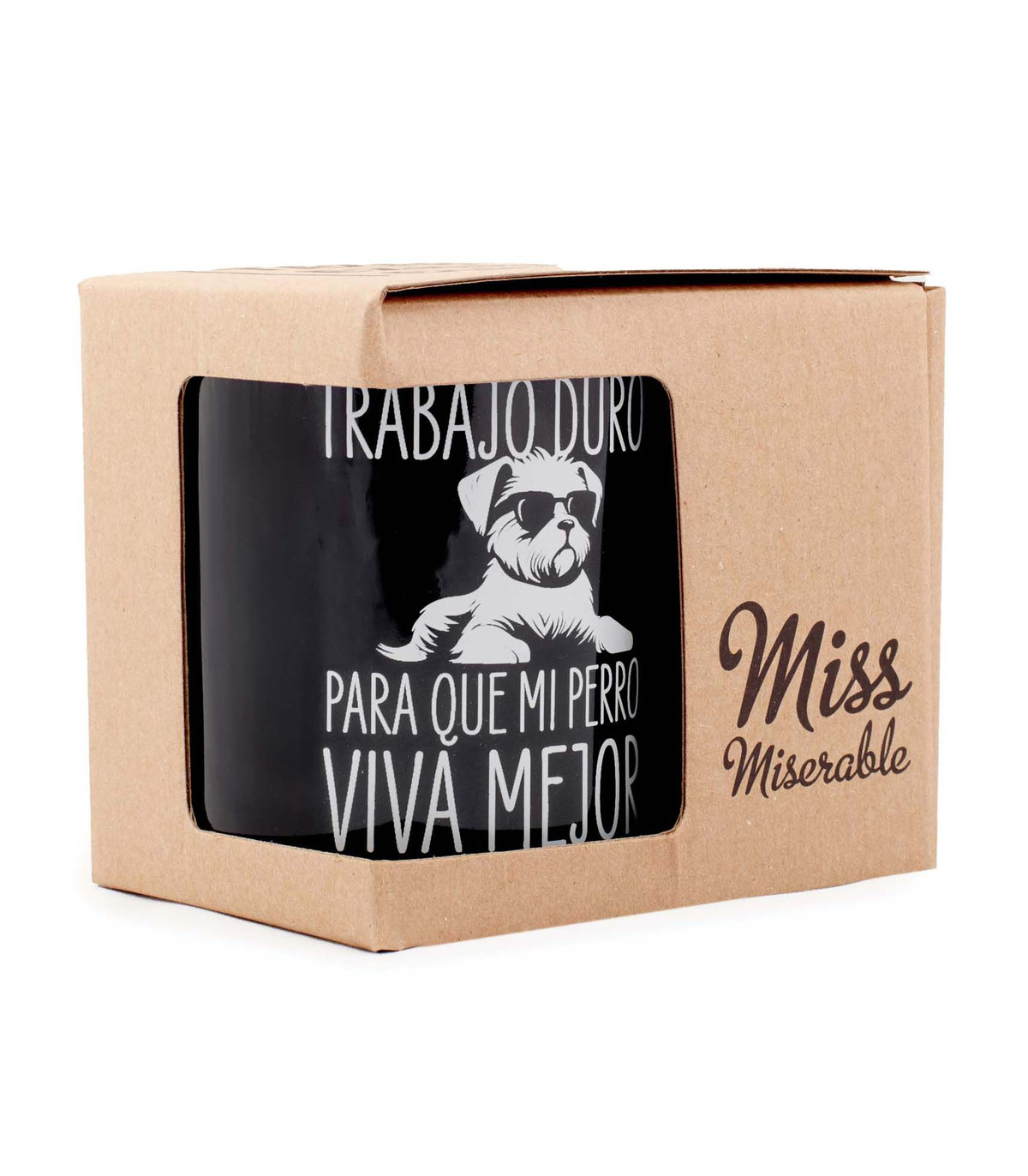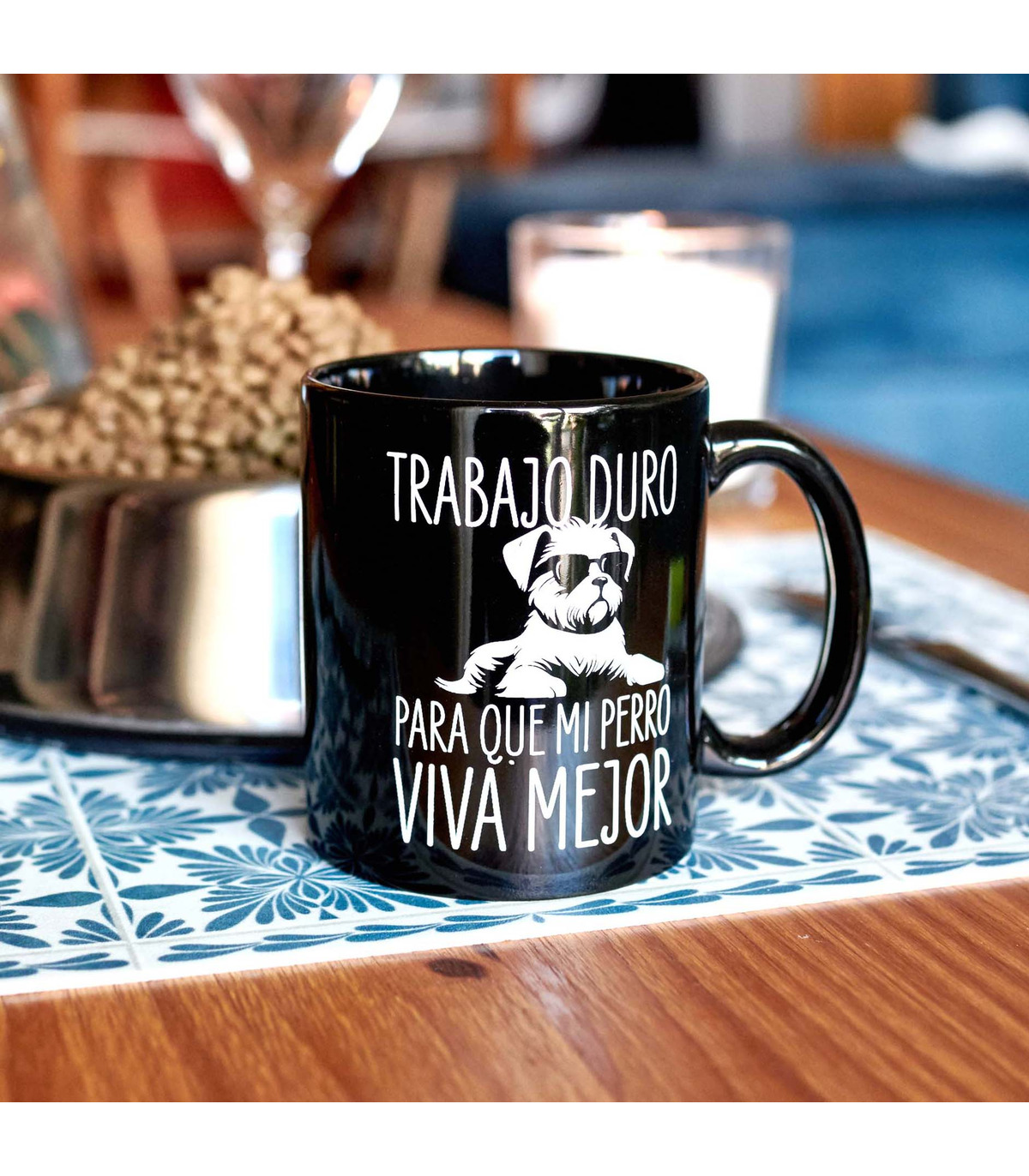 - Taza con el mensaje "Trabajo duro para que mi perro viva mejor" y la ilustración de un perrito con gafas impresos en su parte frontal.