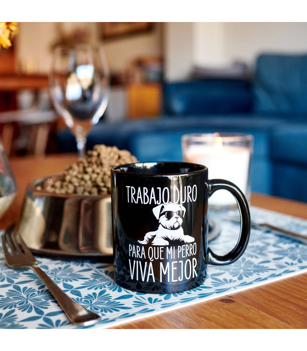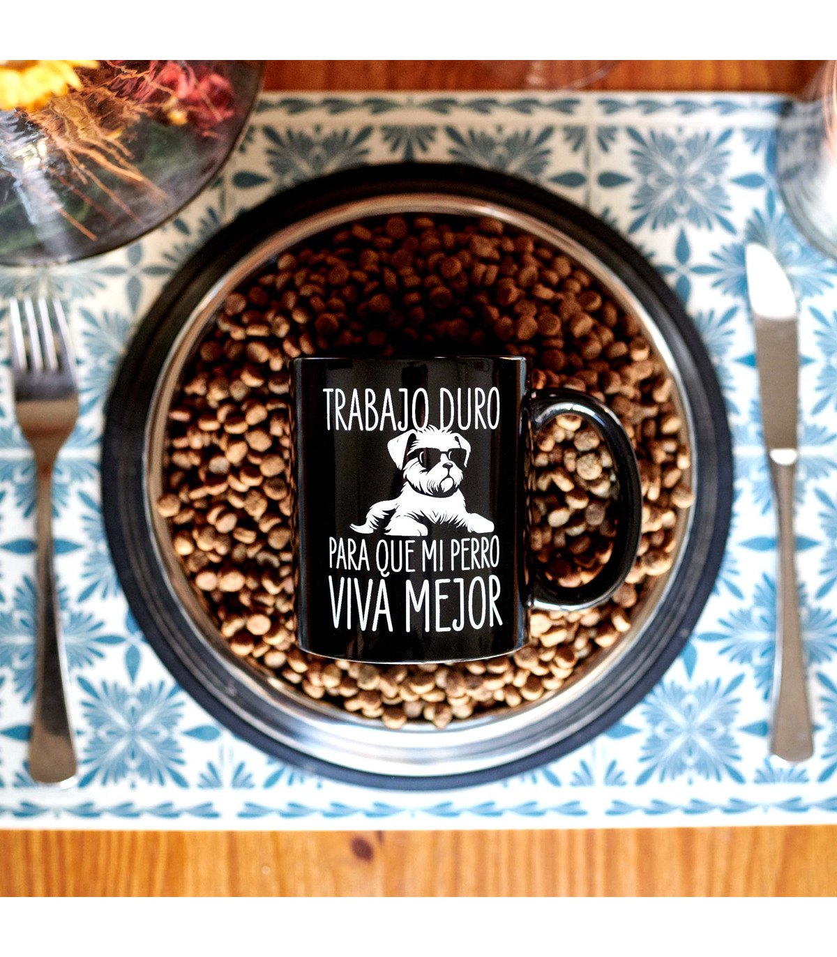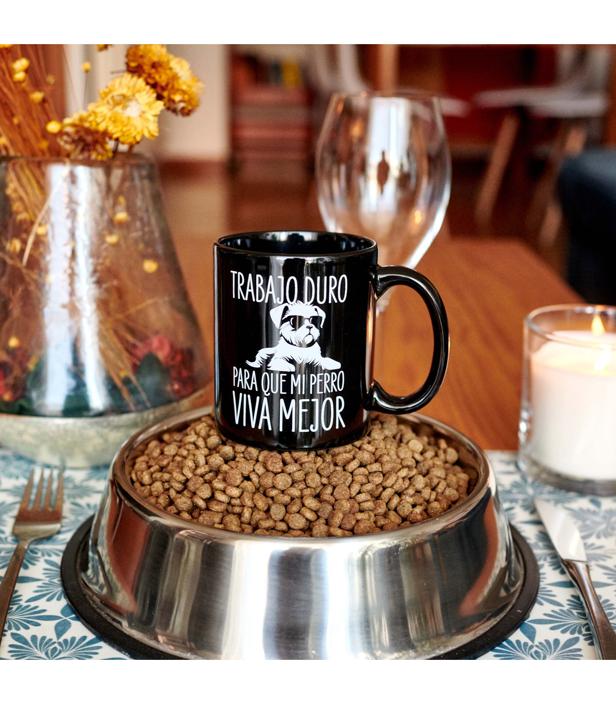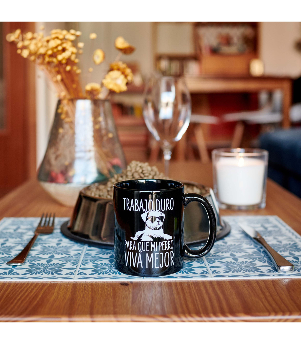 - Taza con el mensaje "Trabajo duro para que mi perro viva mejor" y la ilustración de un perrito con gafas impresos en su parte frontal.