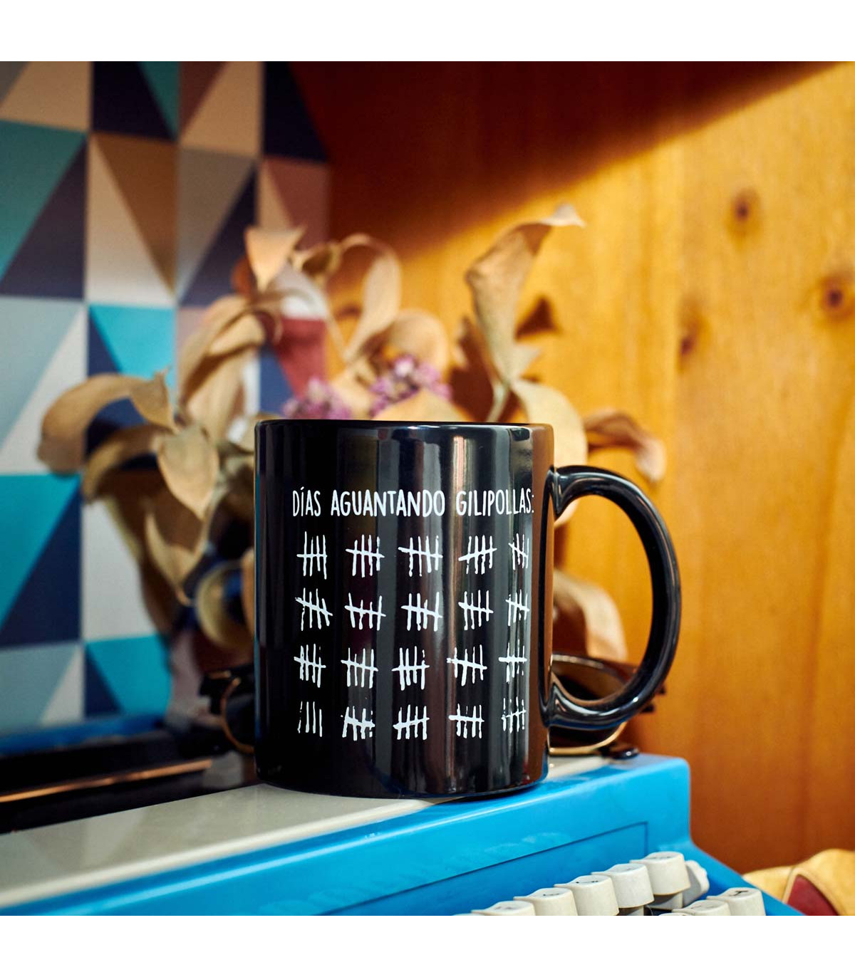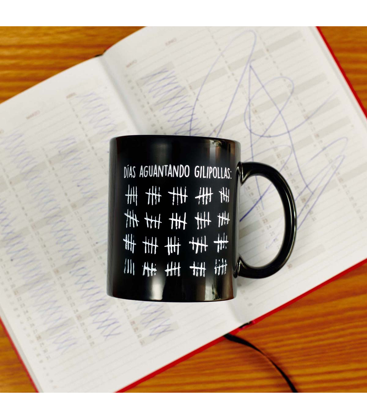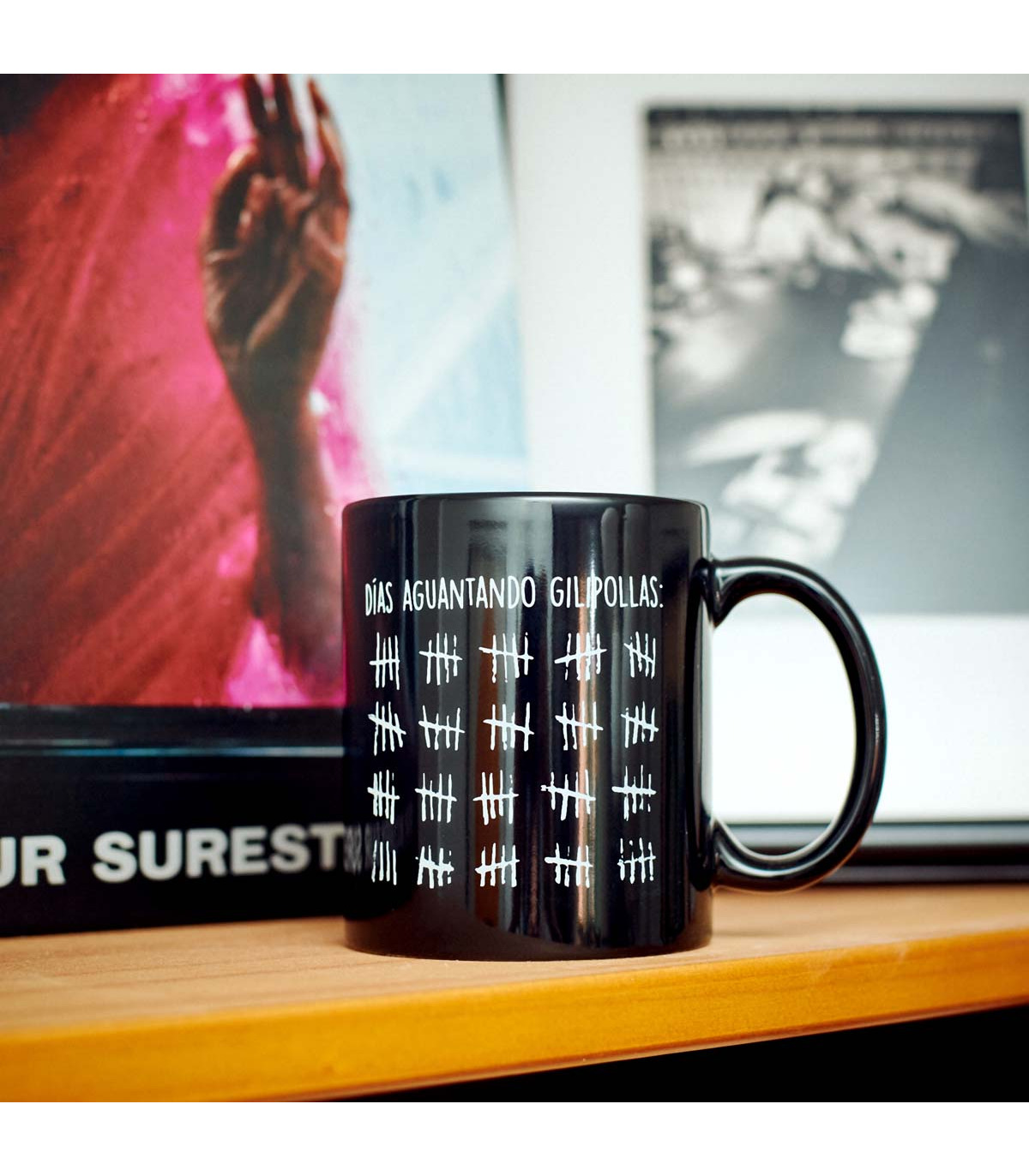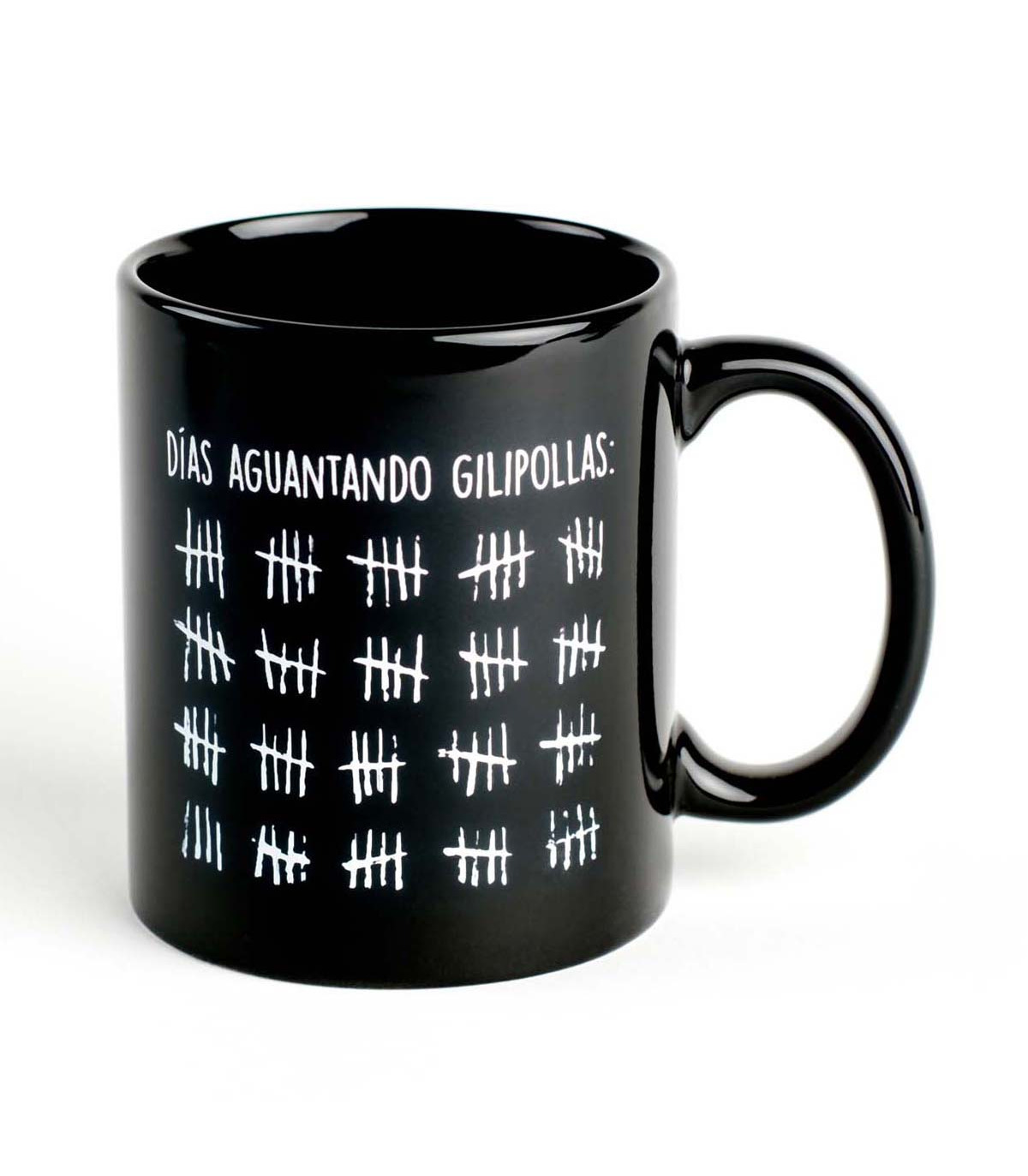 Es de color negro y tiene escrito en color blanco el mensaje "Días aguantando gilipollas" y debajo palitos que indican los días que van pasando. Está fabricada en cerámica y es apta para meter en el lavavajillas y el microondas.