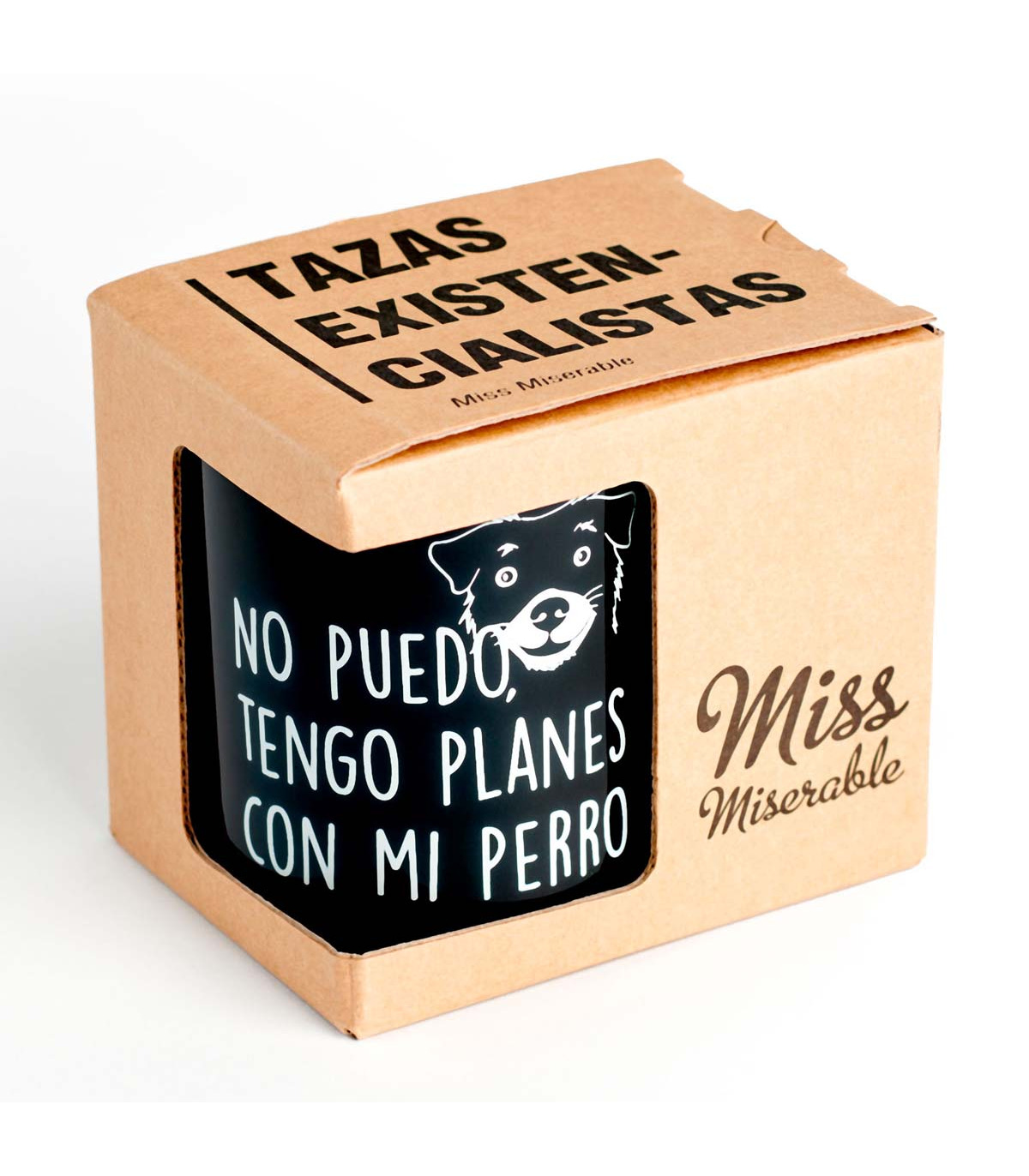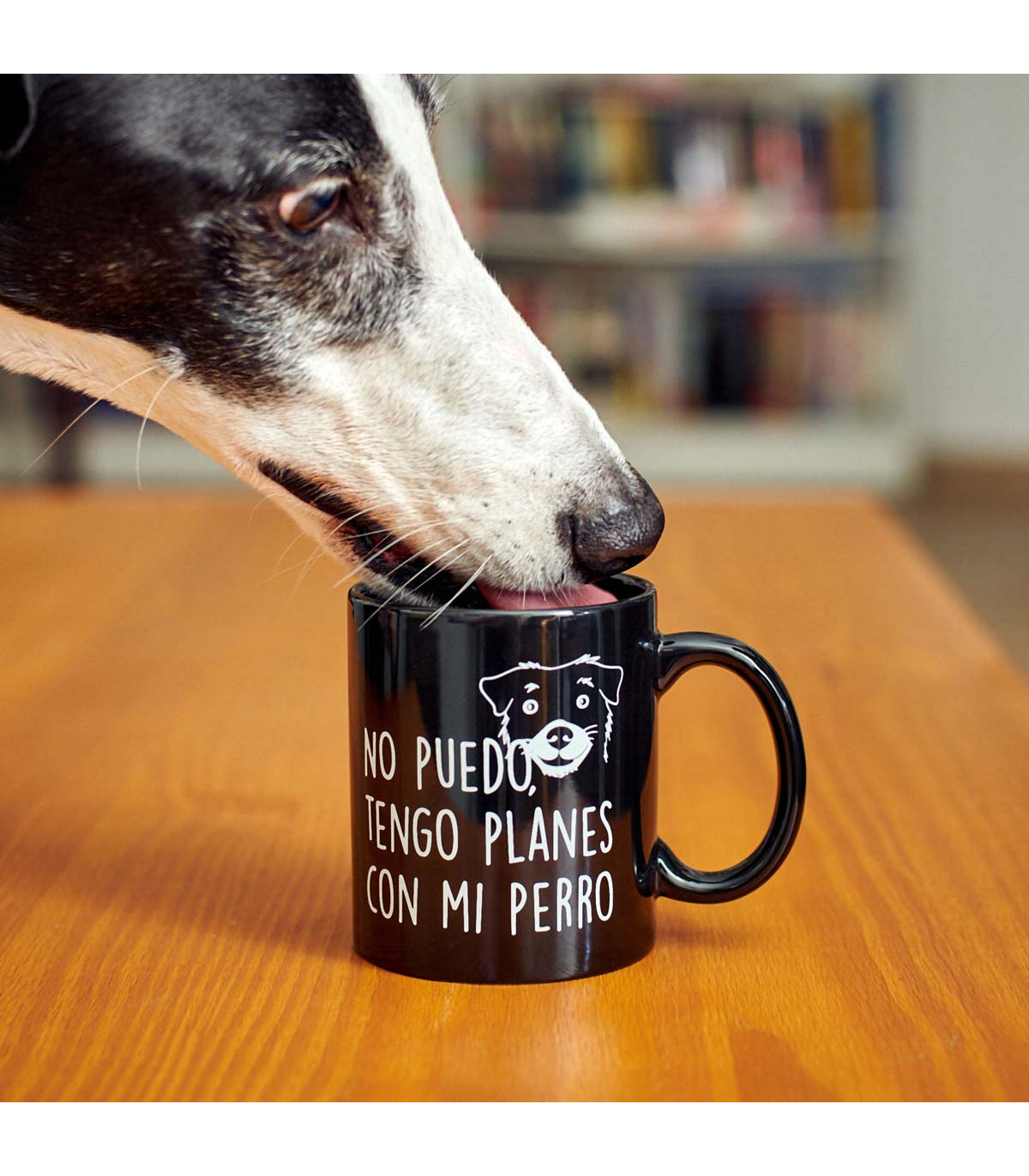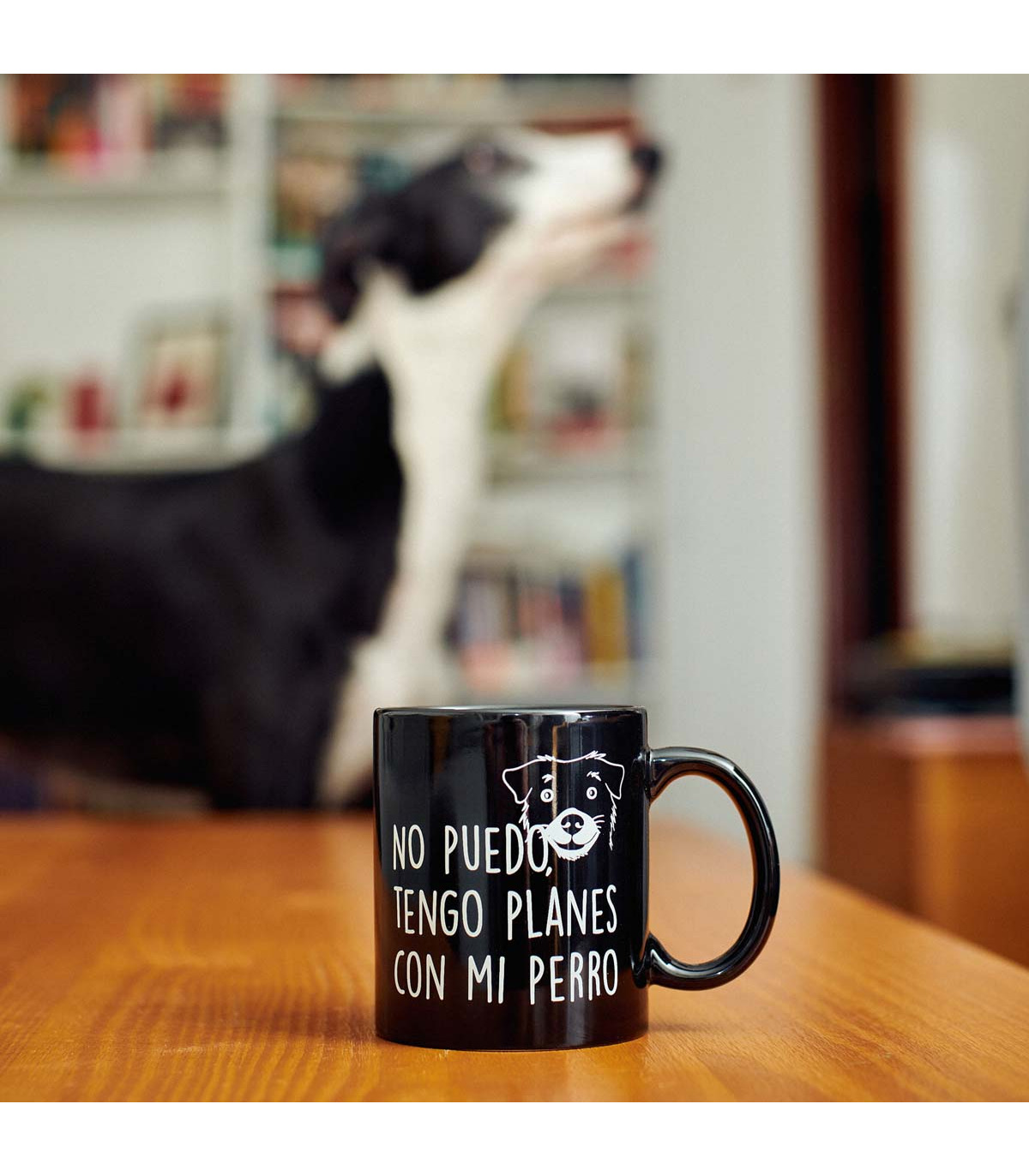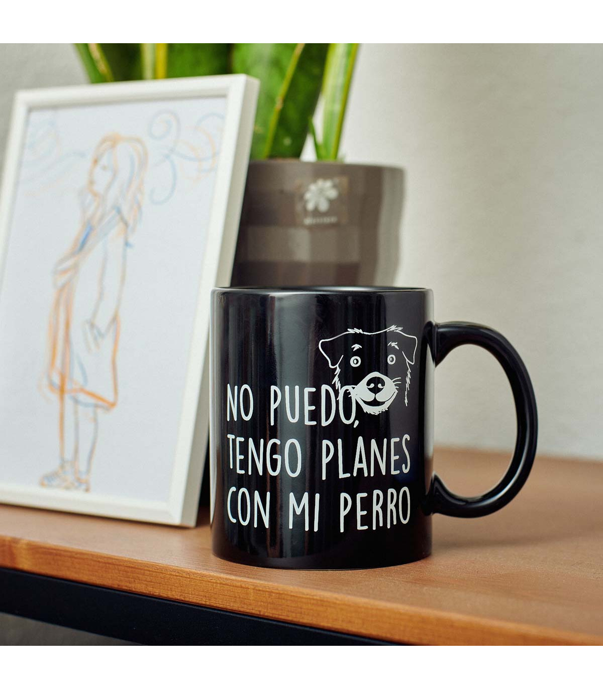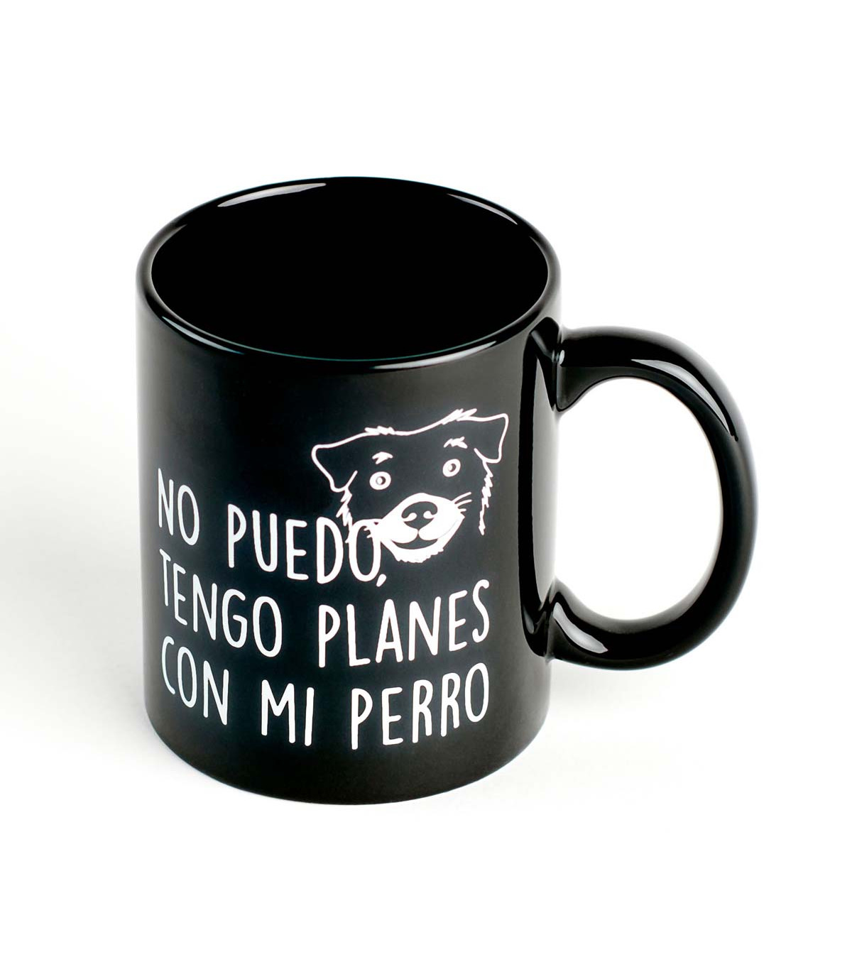 - Taza con el mensaje "No puedo tengo planes con mi perro" y la ilustración de un perrito impresos en su parte frontal.
