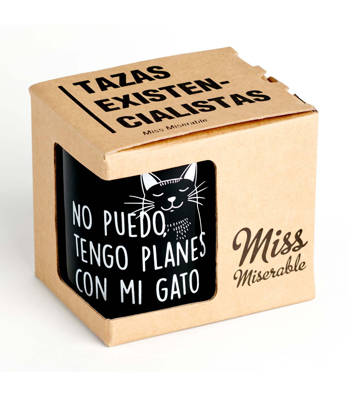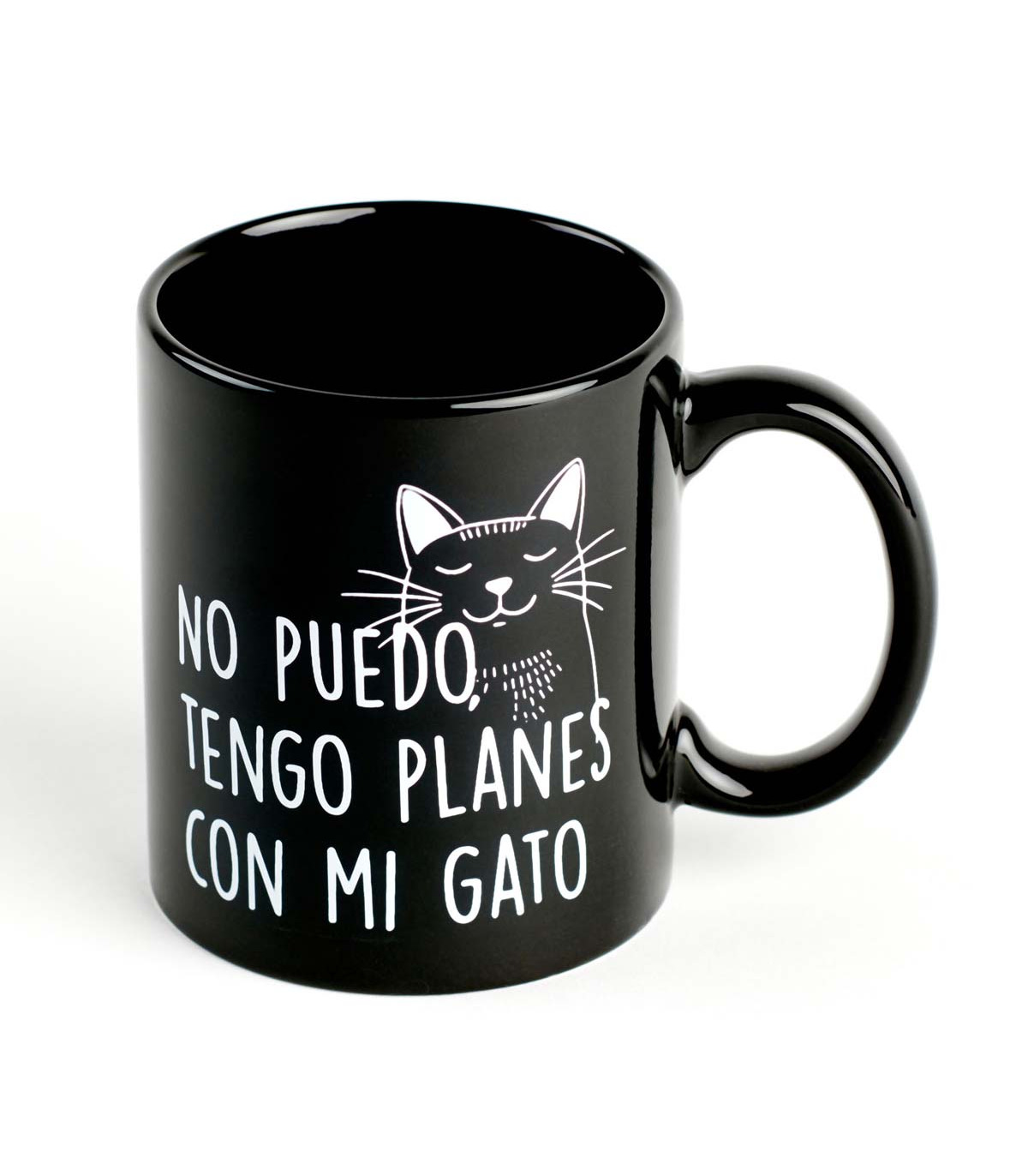 - Taza con el mensaje "No puedo tengo planes con mi gato" y la ilustración de un gatito impresos en su parte frontal.