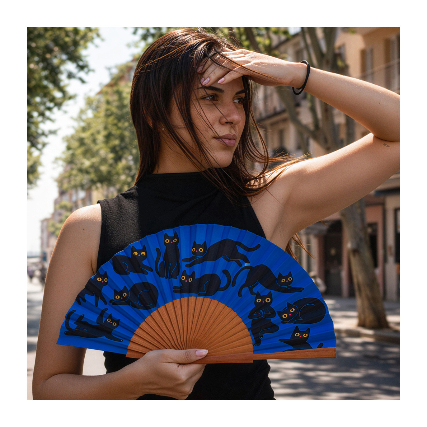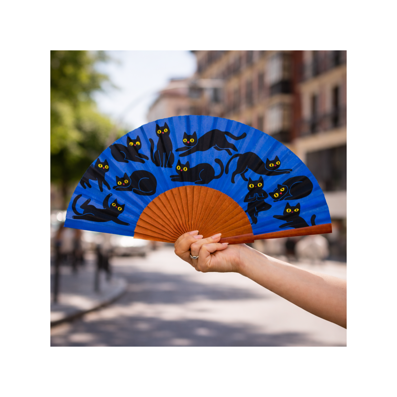 El abanico es, posiblemente, uno de los inventos más brillantes de la historia: permite refrescarse con estilo, sin ruidos y sin consumo energético. Este modelo recoge esa sabiduría tradicional y la combina con un divertido diseño felino.