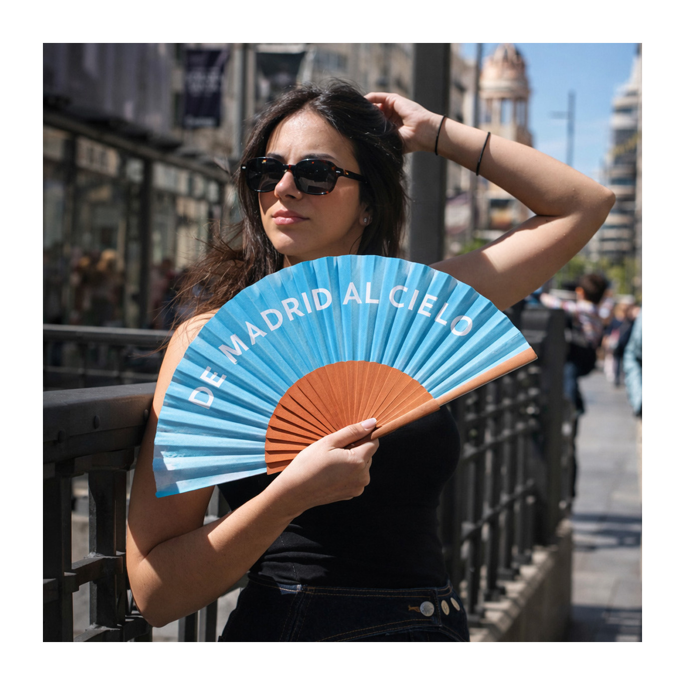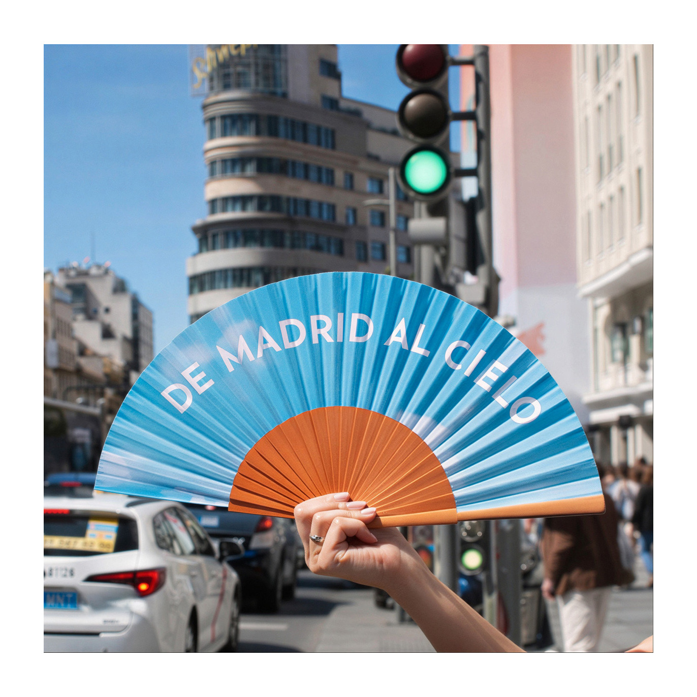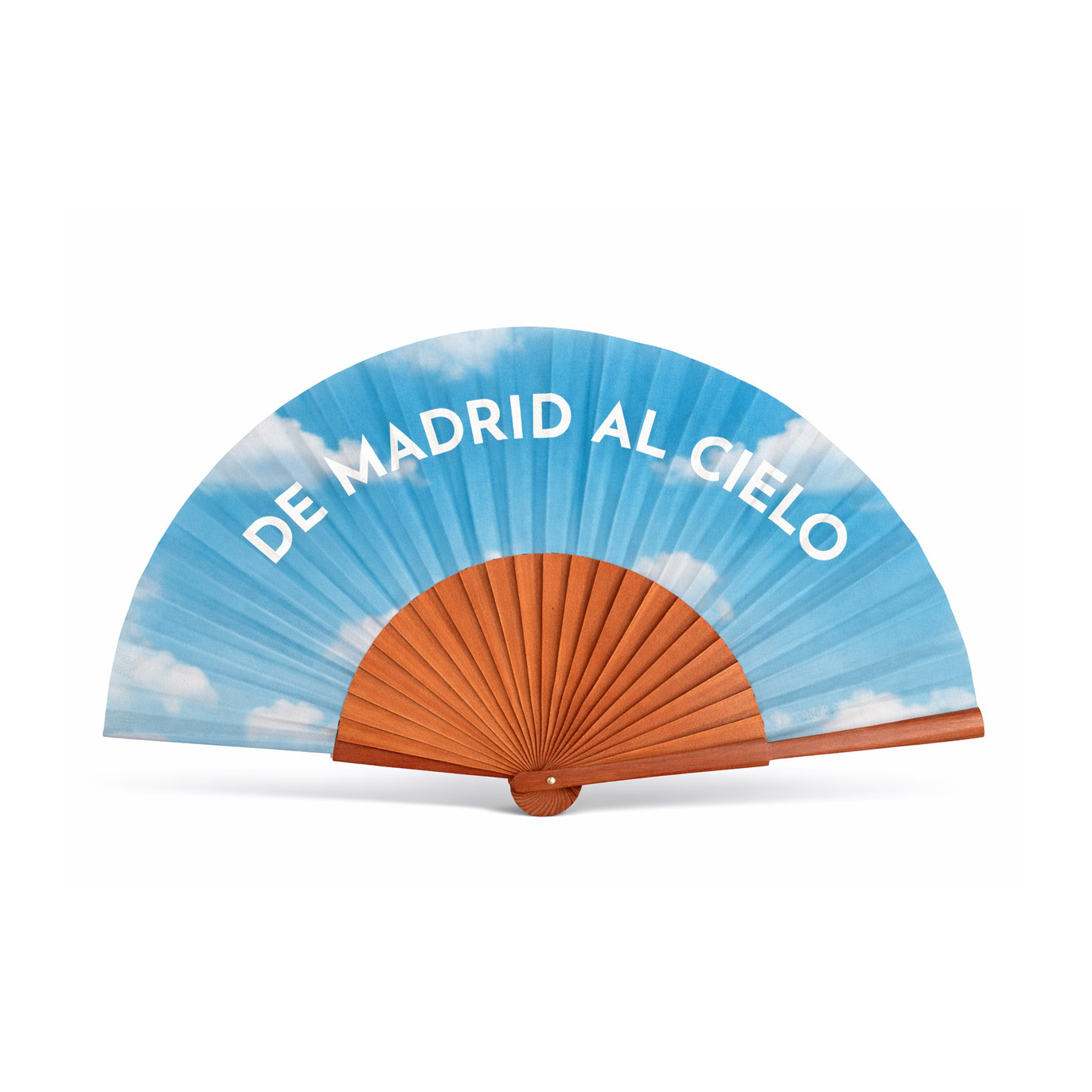Mide 23 cm de alto y 42 cm abierto, está fabricado en madera de alta densidad y tejido de polialgodón 100D. El paisaje (la tela que une las varillas) muestra un cielo azul salpicado de nubes con el mensaje “De Madrid al cielo”, un guiño al orgullo madrileño y a esa forma tan nuestra de decir que no hay lugar como la capital.