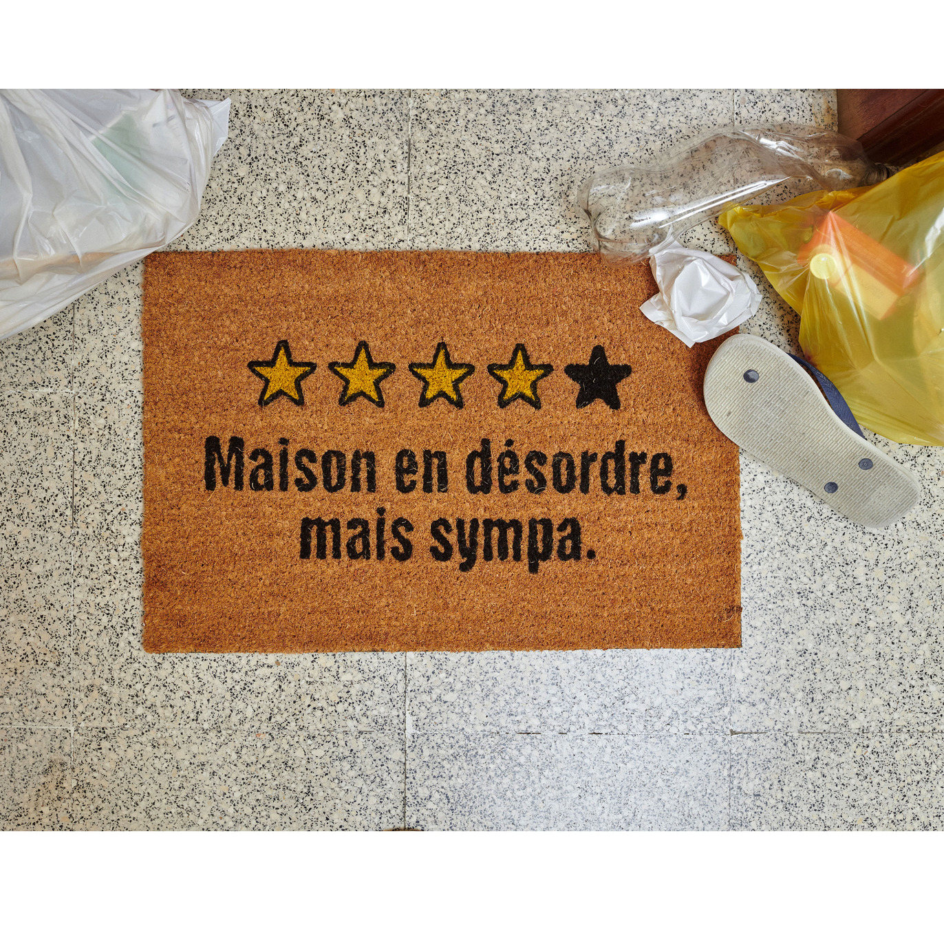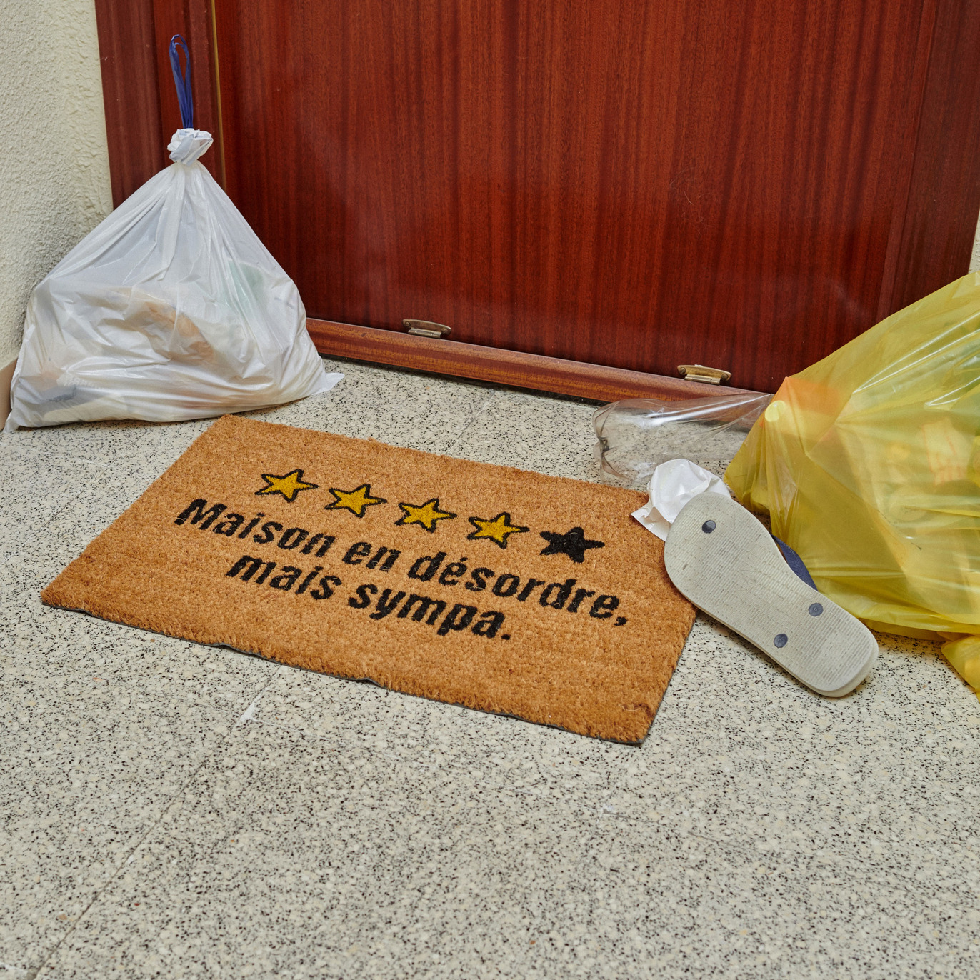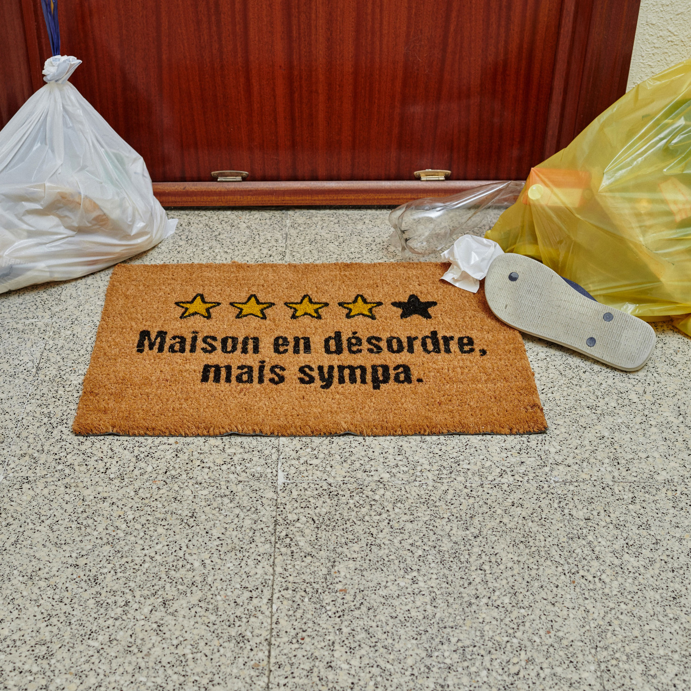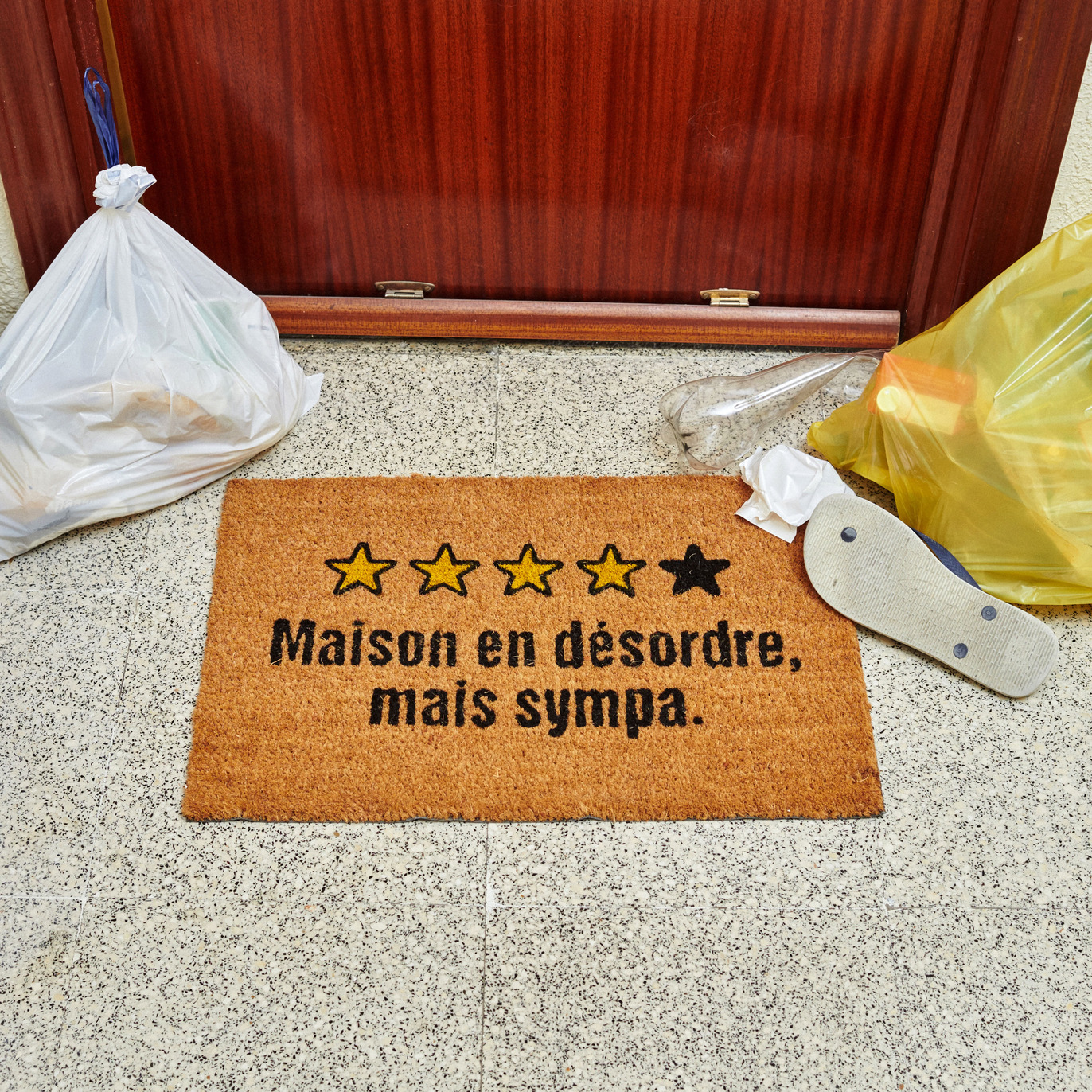 - Paillasson original portant le message « Maison désordonnée, mais proprios sympas » imprimé en noir.