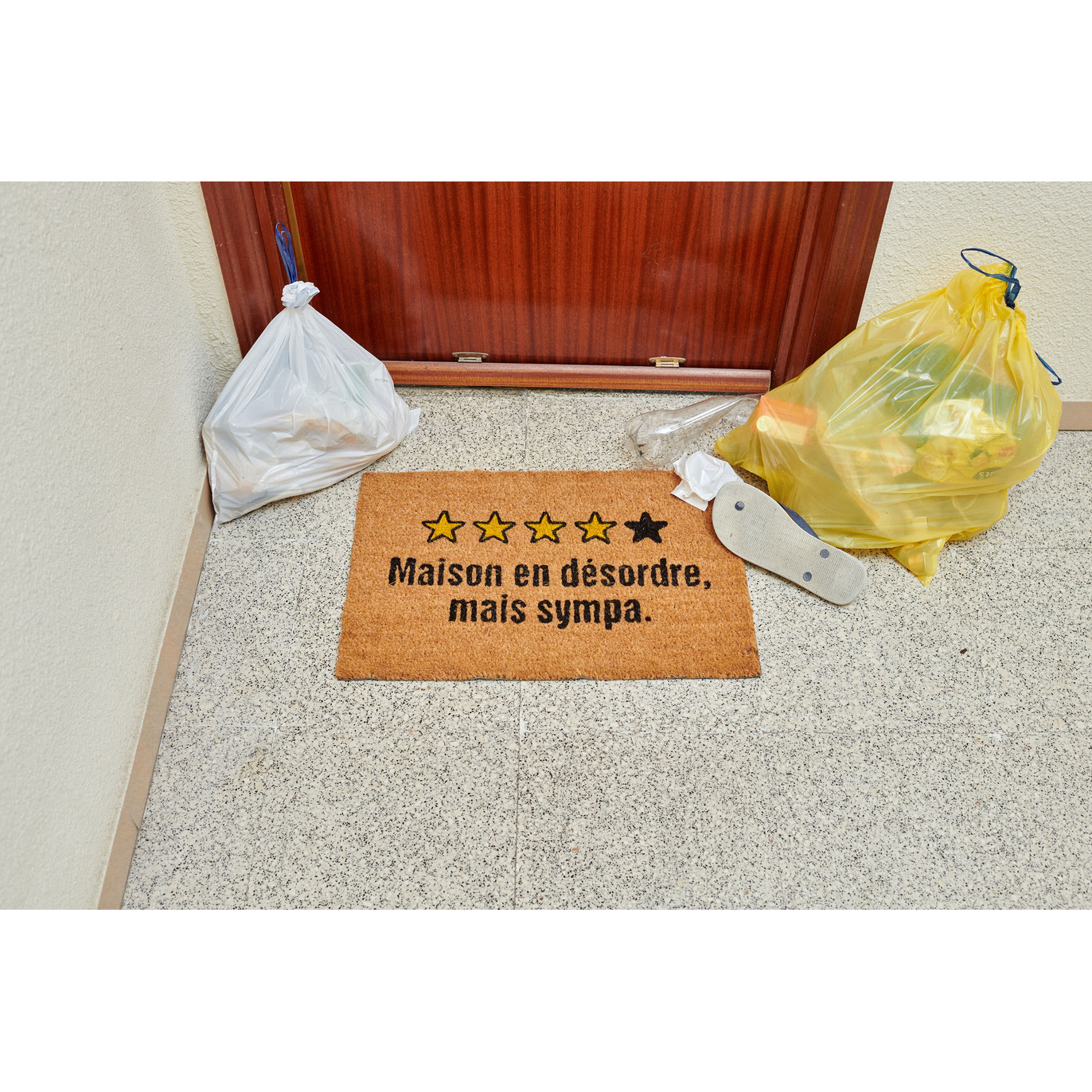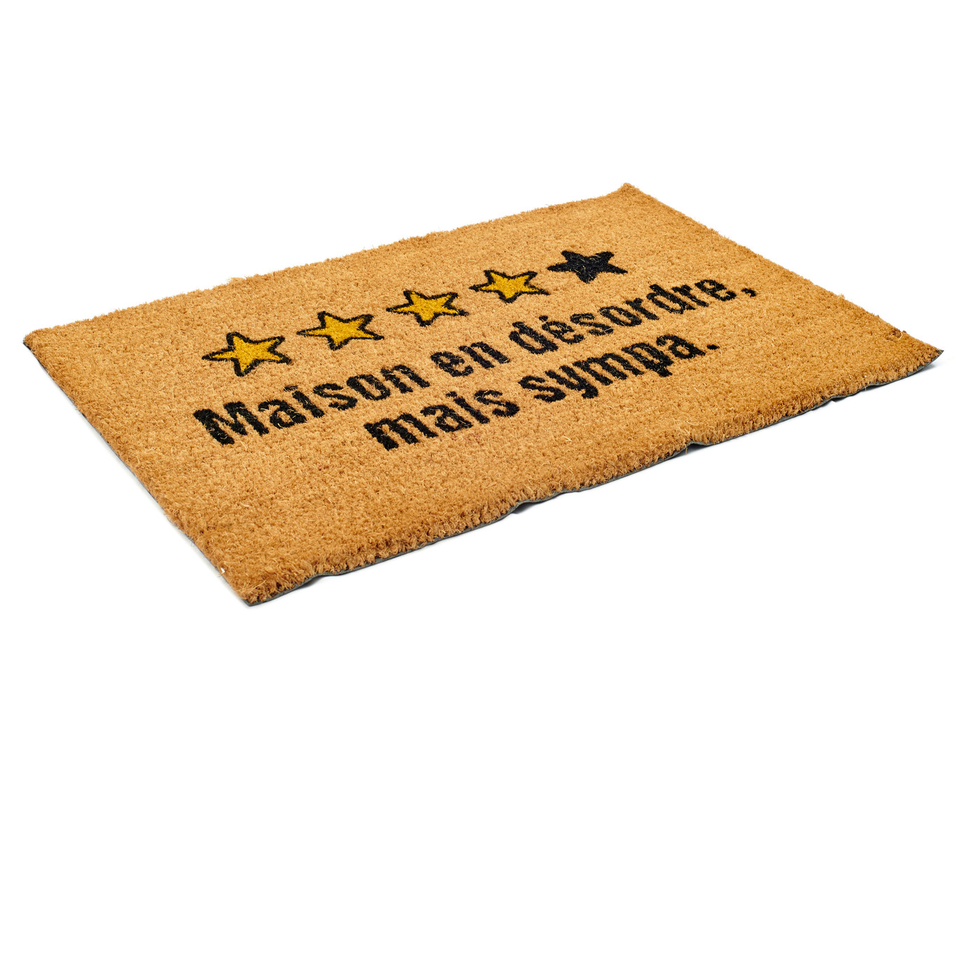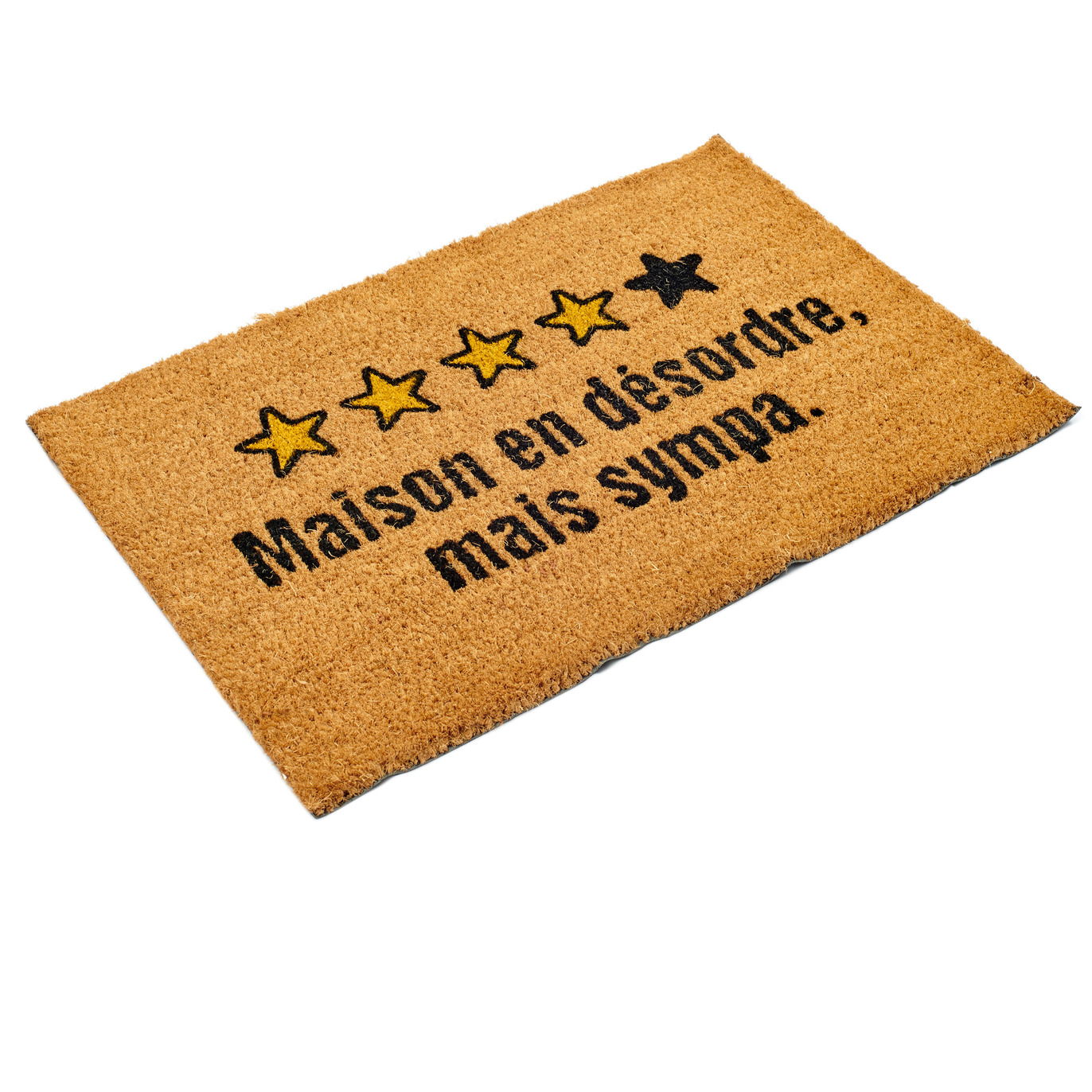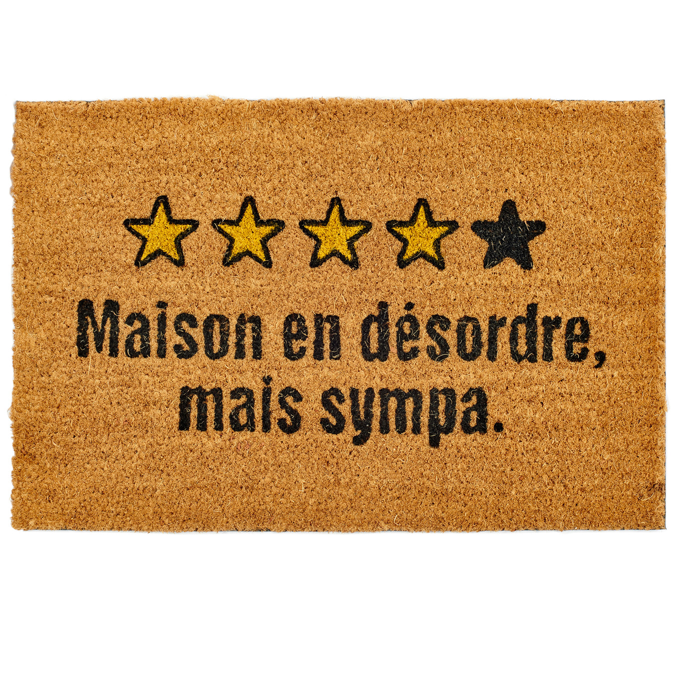 - Paillasson original portant le message « Maison désordonnée, mais proprios sympas » imprimé en noir.