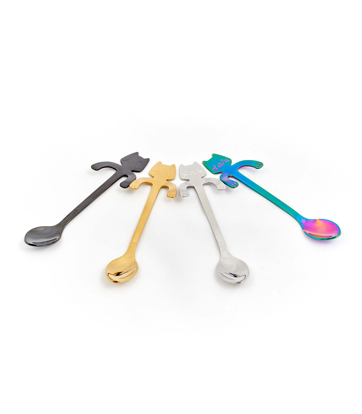 Le set se compose de quatre cuillères avec des chatons de différentes couleurs métalliques : noir, or, argent et irisé. Elles sont très résistantes et durables, car elles sont fabriquées en acier inoxydable et passent au lave-vaisselle.